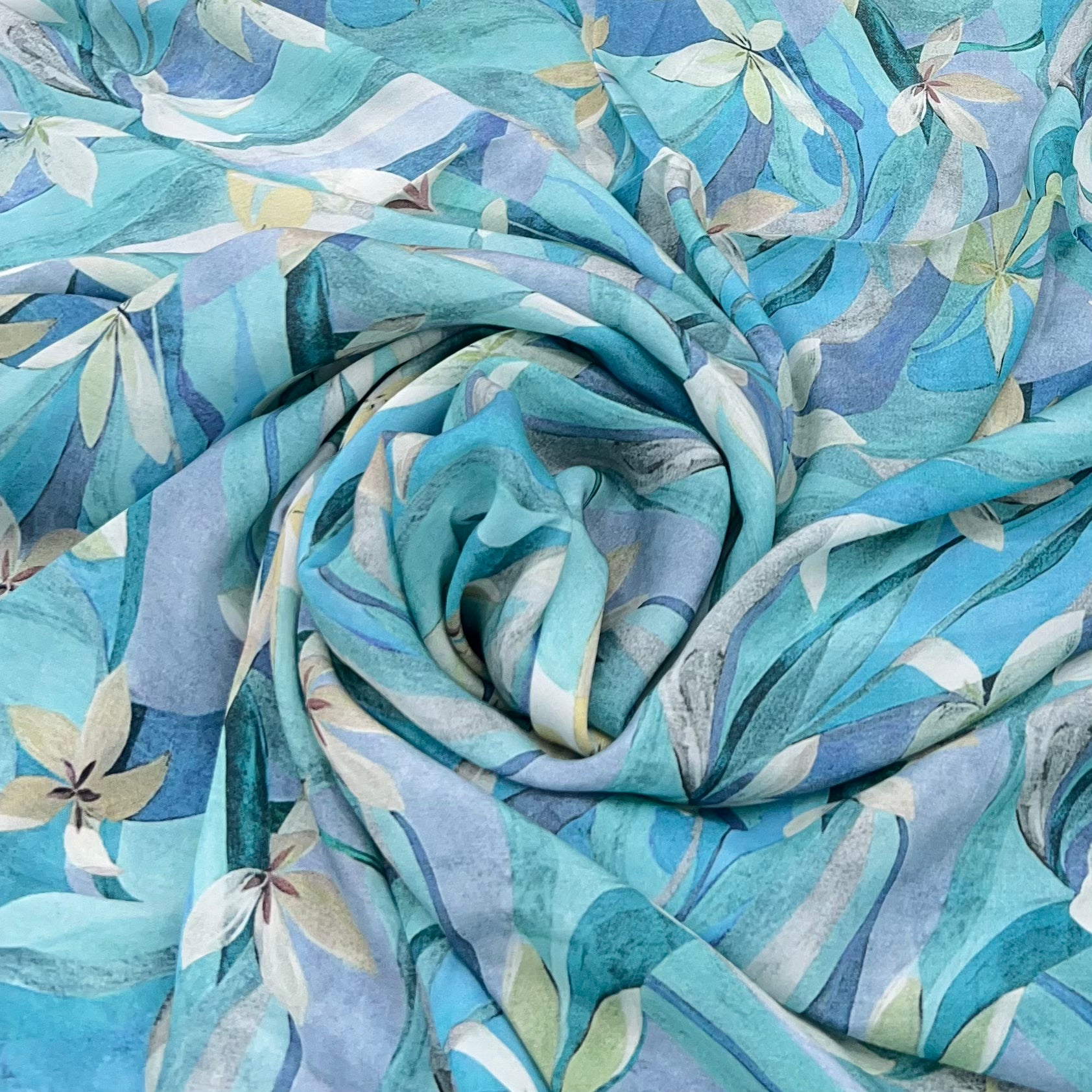 Crepe cutwork fabric features a lightweight, textured crepe base adorned with intricate cut-out patterns, creating a delicate, semi-sheer effect. Its elegant drape and detailed craftsmanship make it perfect for stylish apparel, sophisticated overlays, and statement pieces