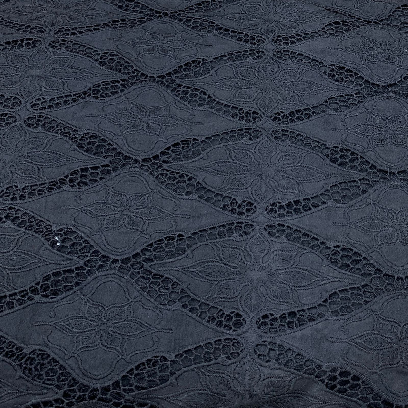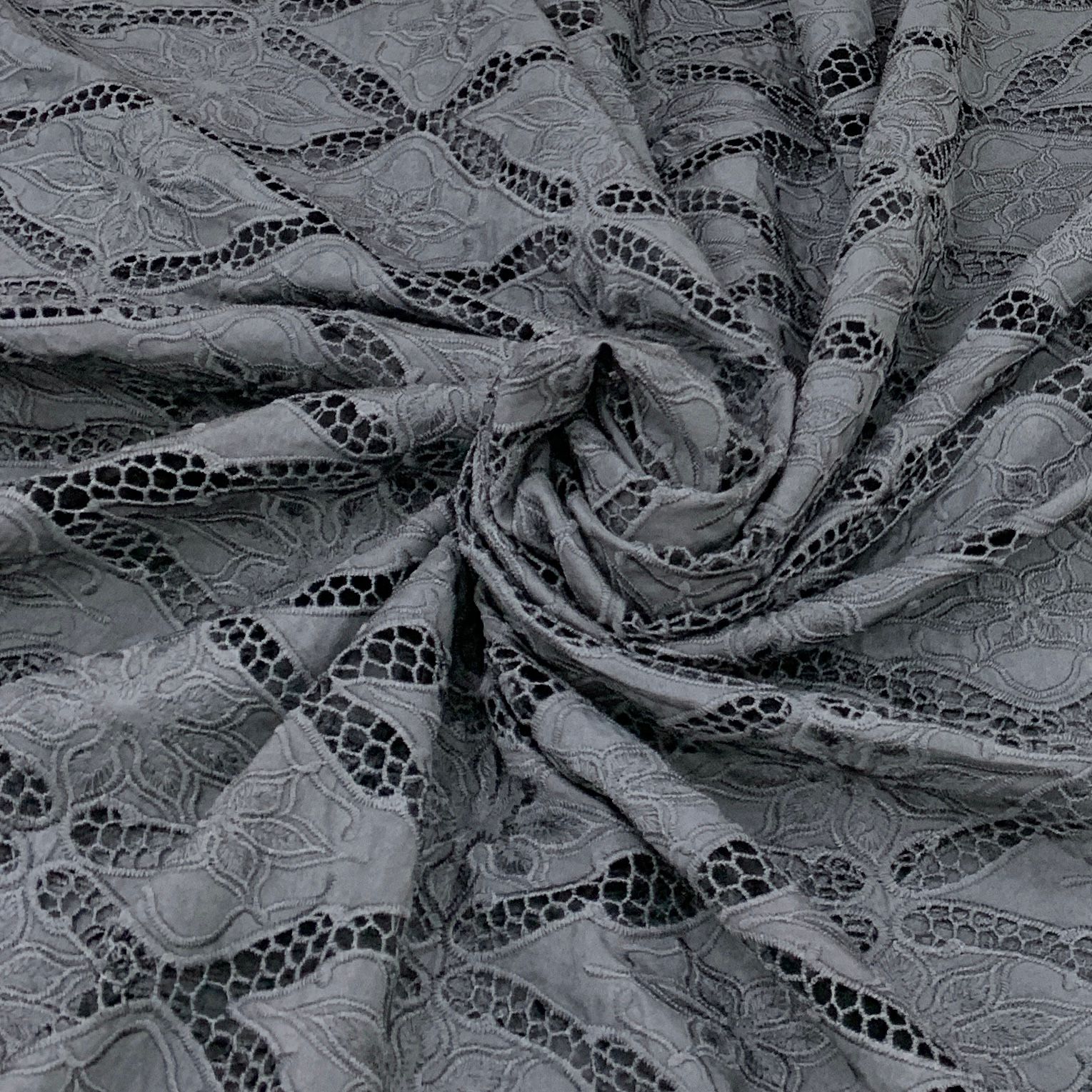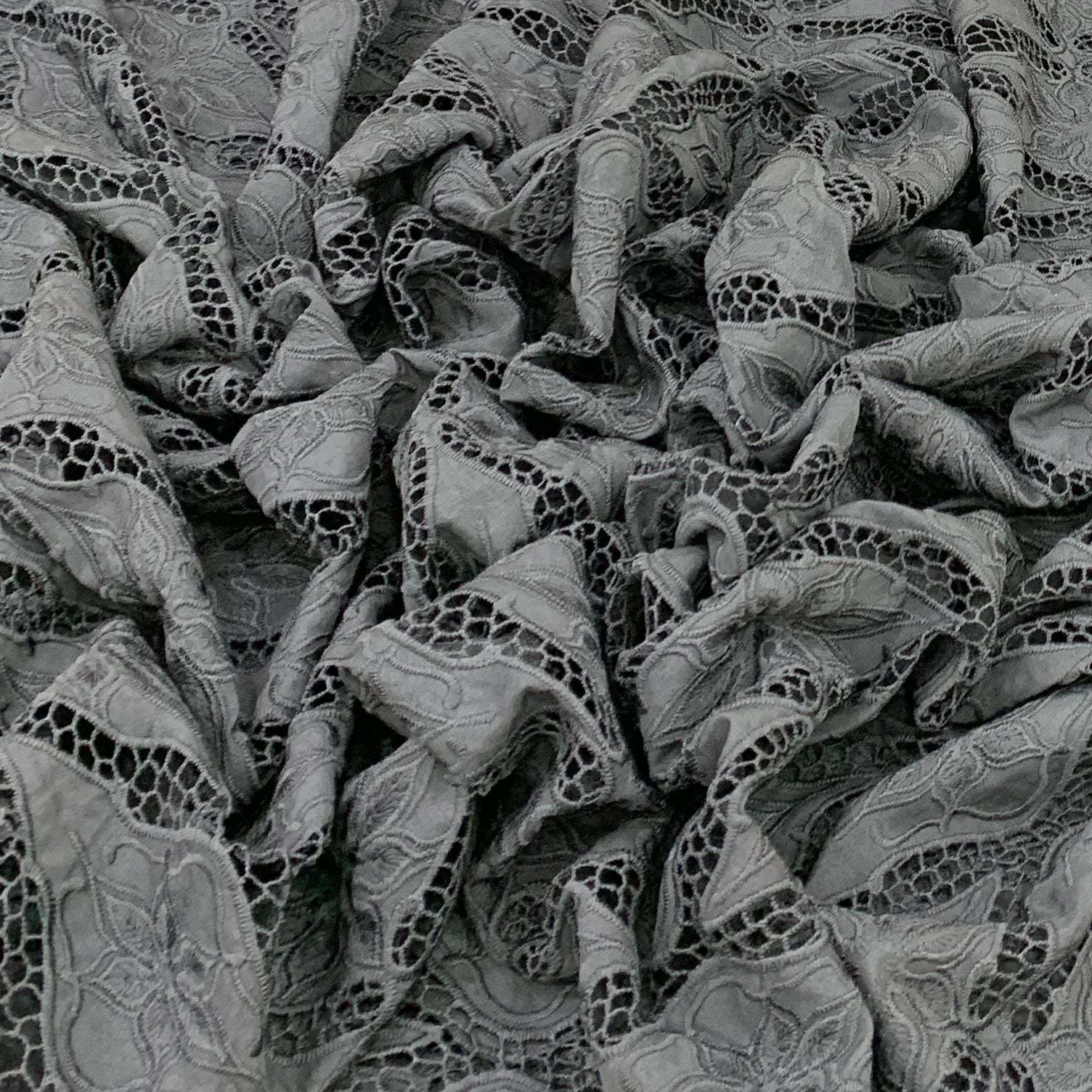 Crepe cutwork fabric features a lightweight, textured crepe base adorned with intricate cut-out patterns, creating a delicate, semi-sheer effect. Its elegant drape and detailed craftsmanship make it perfect for stylish apparel, sophisticated overlays, and statement pieces