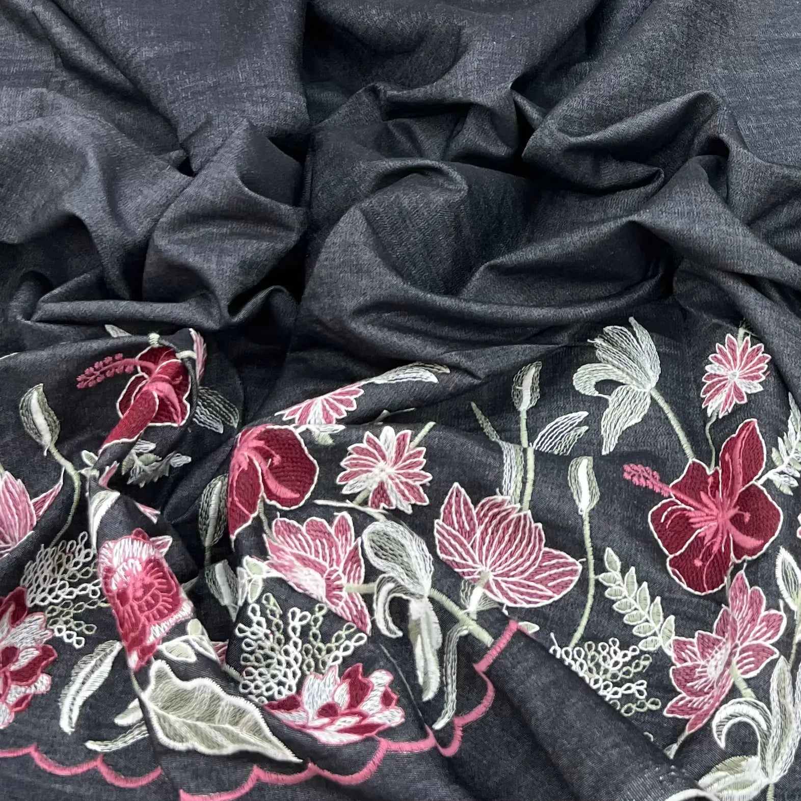 Embroidered denim fabric combines the durability of denim with decorative stitched details for a stylish twist. Strong yet versatile, it’s perfect for jackets, skirts, dresses, and statement outfits, adding character, texture, and a fashion-forward edge to everyday wear