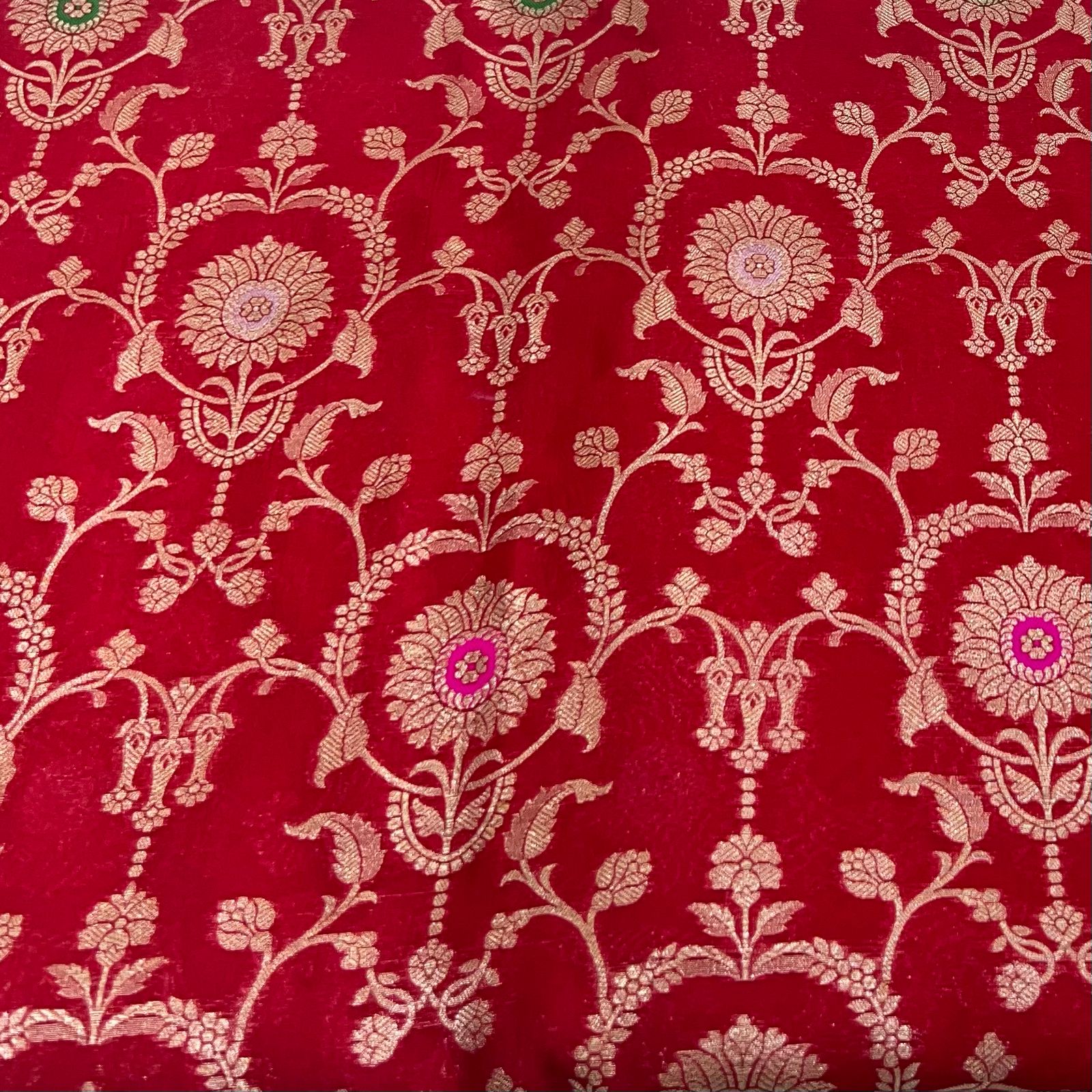 Silk brocade is an opulent fabric crafted with elaborate designs in silk and metallic threads, creating a richly textured surface. Celebrated for its durability and majestic appeal, it is perfect for sarees, lehengas, sherwanis, jackets, and festive attire, bringing a touch of timeless luxury to every creation