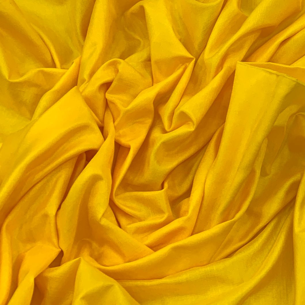 Bright Yellow Plain Pure Silk Fabric. Continuous filaments of silk, with no twist, which have been reeled from cocoons but are unprocessed and comes with a slub effect. Raw Silk has a nubby feel with a low sheen. It resembles cotton in surface texture and sews easily. When these short fibers are spun into yarns, the resulting yarns have occasional slubs and specks that add to its appeal. Nubs vary between different weaves. Sportier in appearance, Raw Silk has the look of hopsack but is much softer.