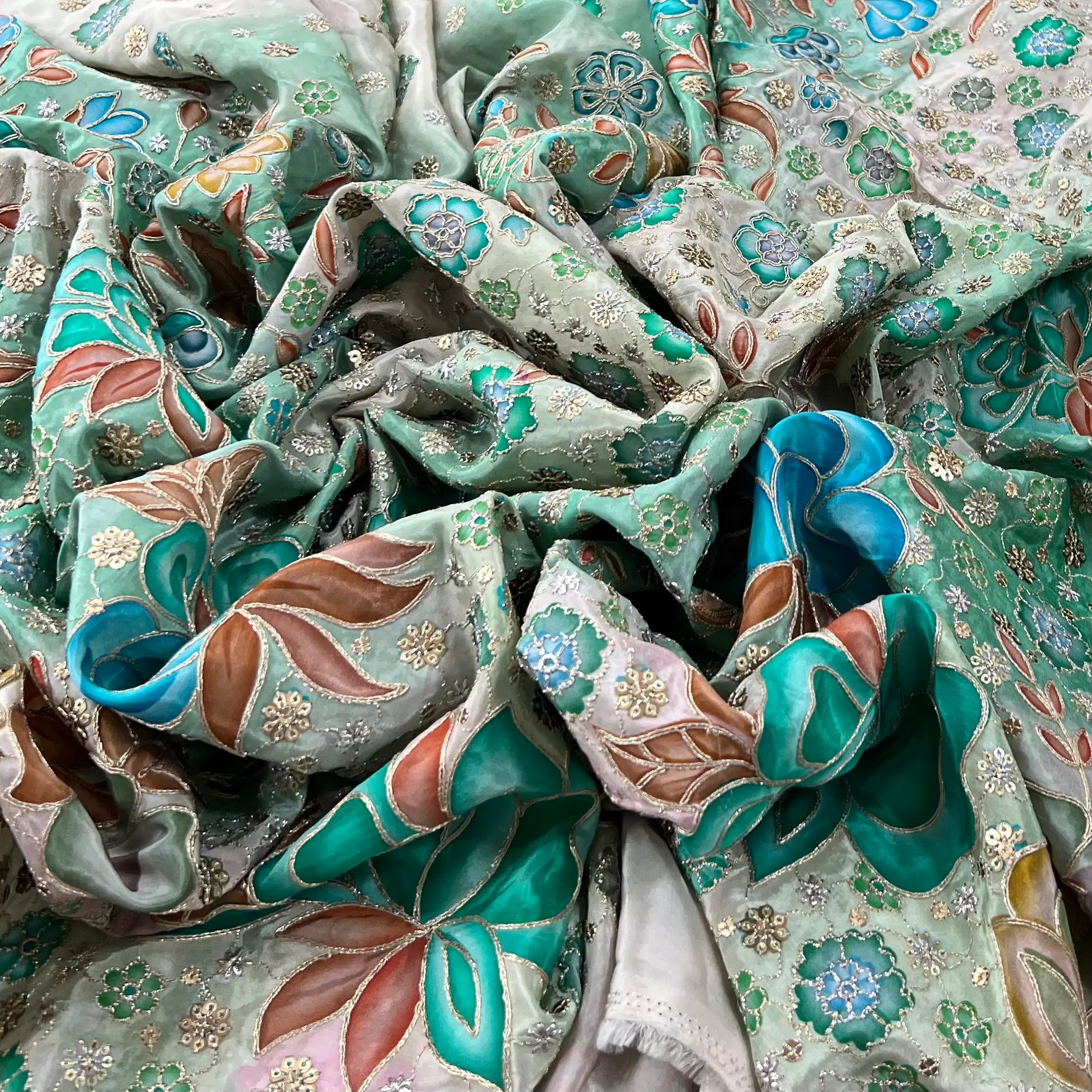 Green Blue Printed Sequins Thread Crepe Embroidery