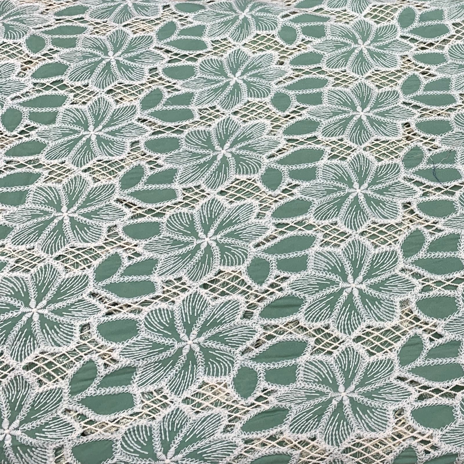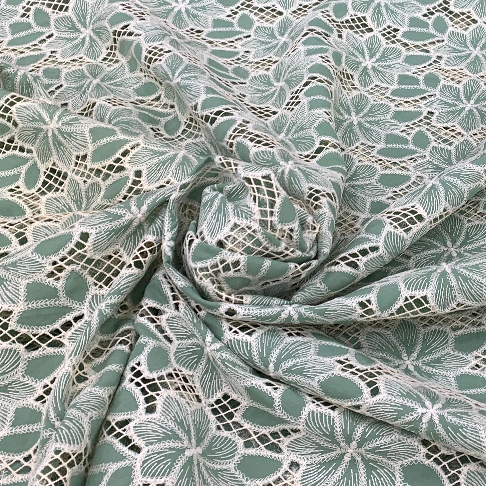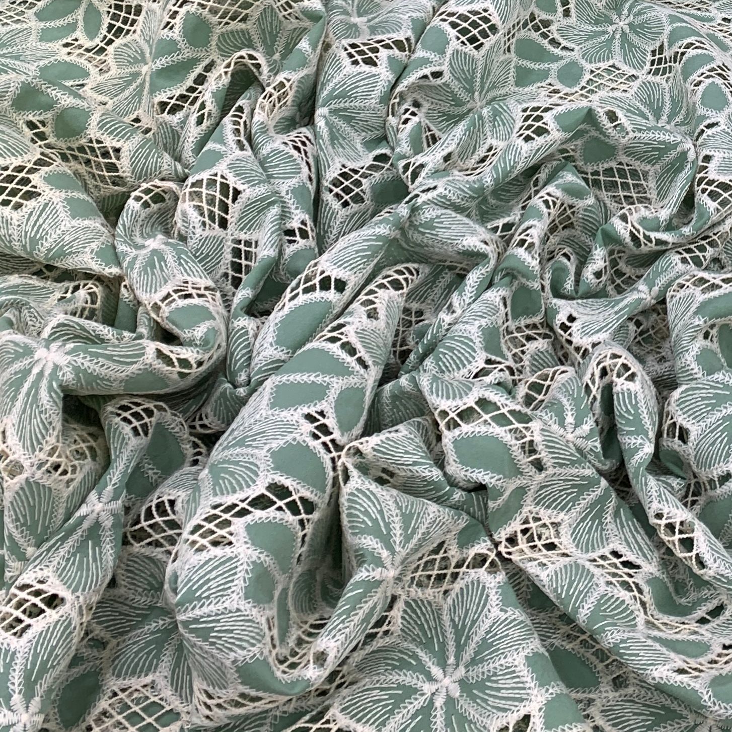 Crepe cutwork fabric features a lightweight, textured crepe base adorned with intricate cut-out patterns, creating a delicate, semi-sheer effect. Its elegant drape and detailed craftsmanship make it perfect for stylish apparel, sophisticated overlays, and statement pieces