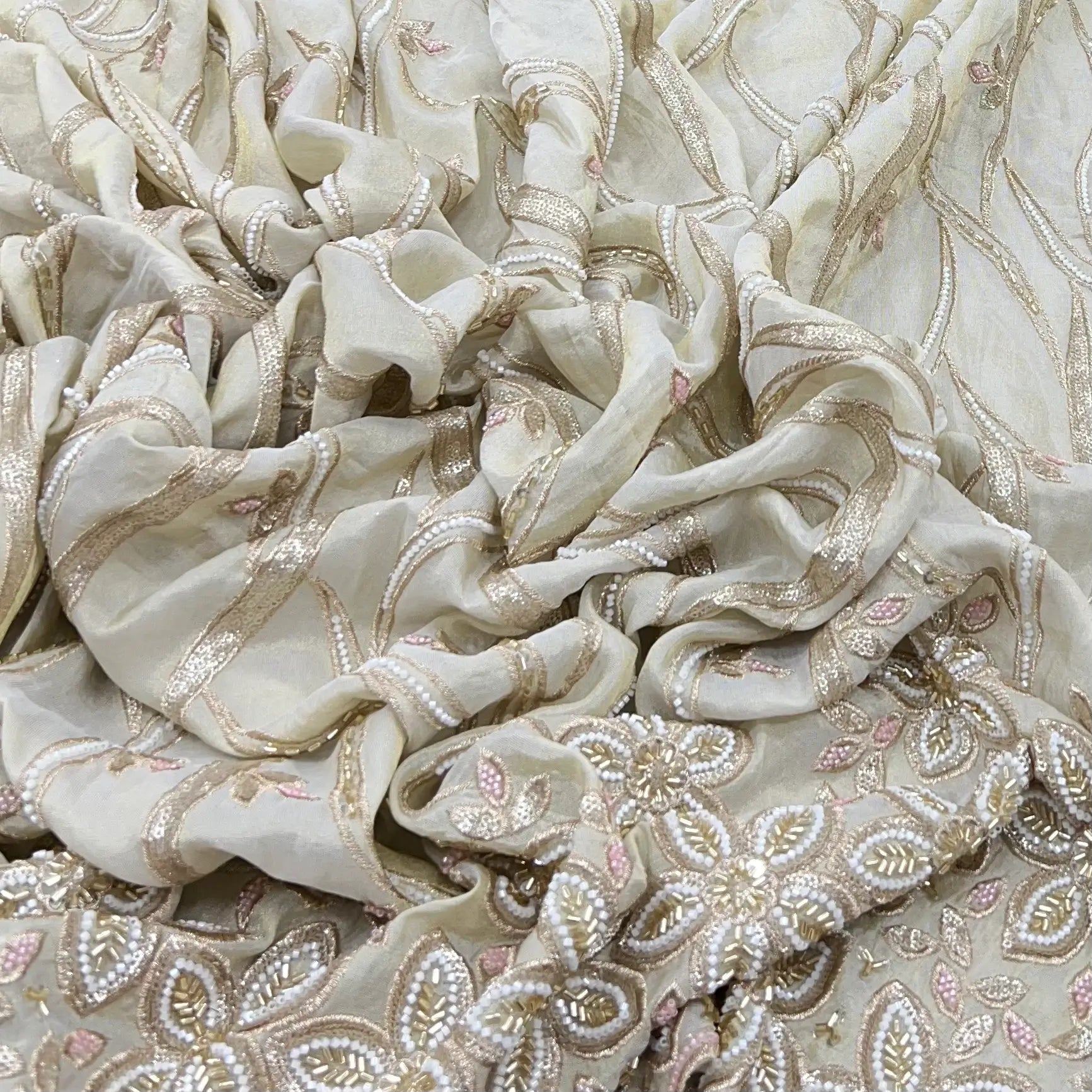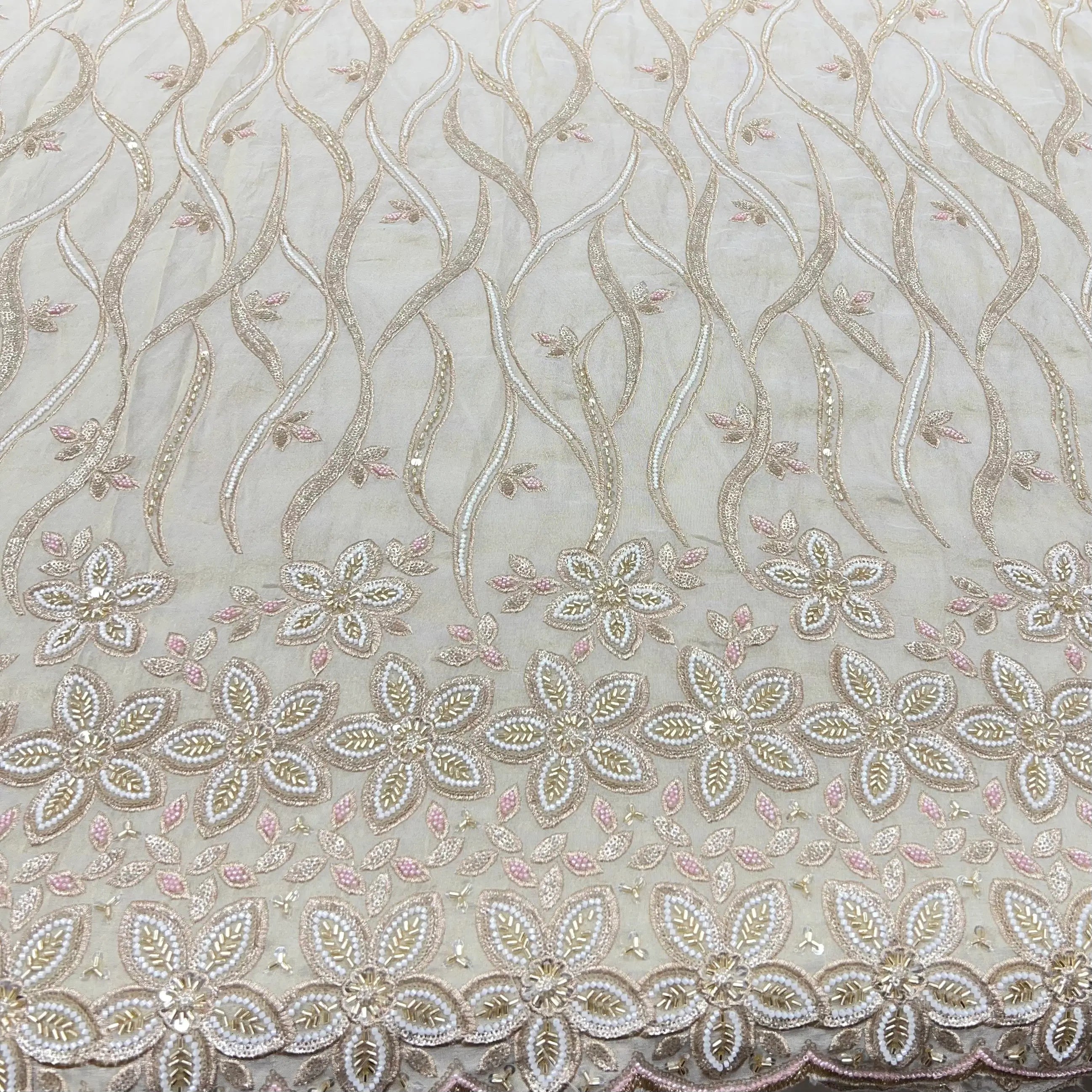 Light Gold Floral Sequins & Cut Dana Tissue Daman Embroidery