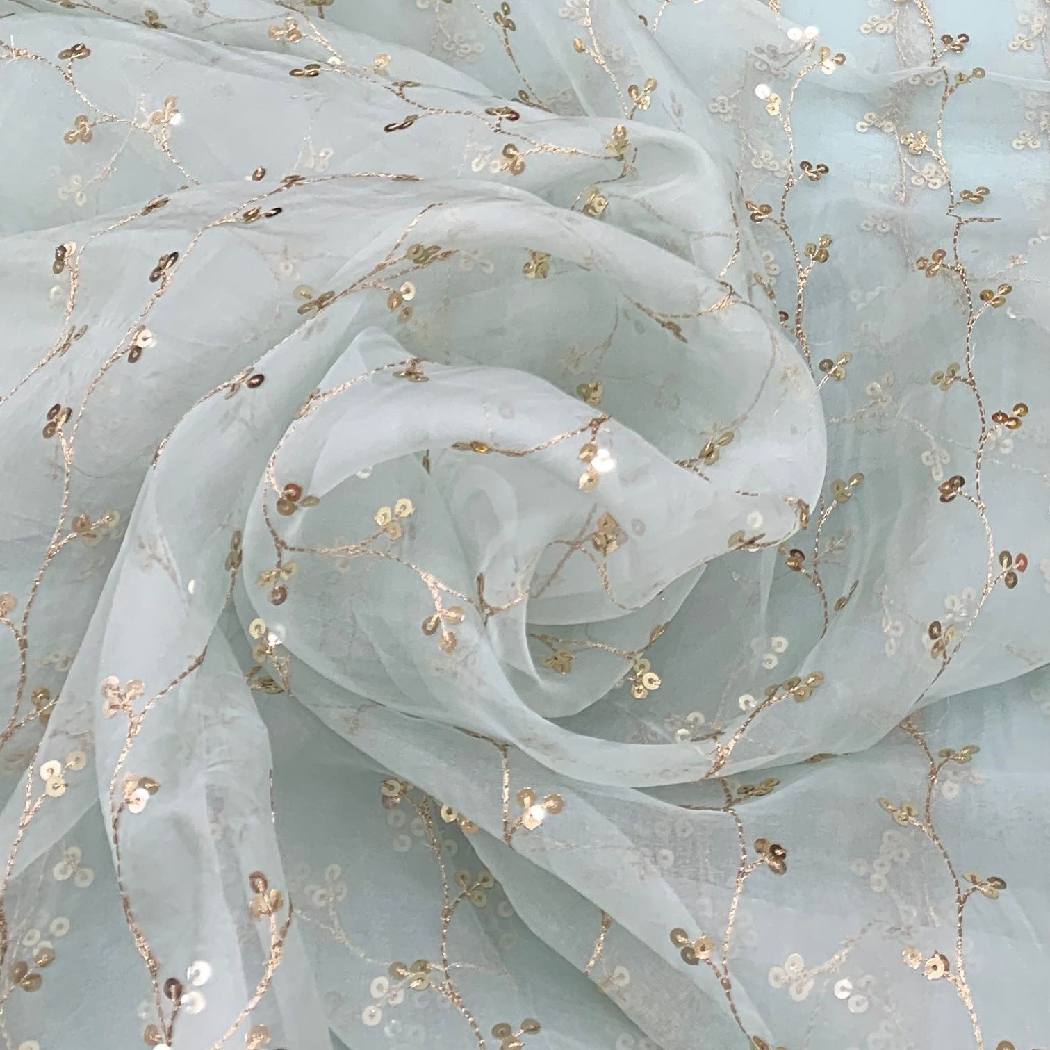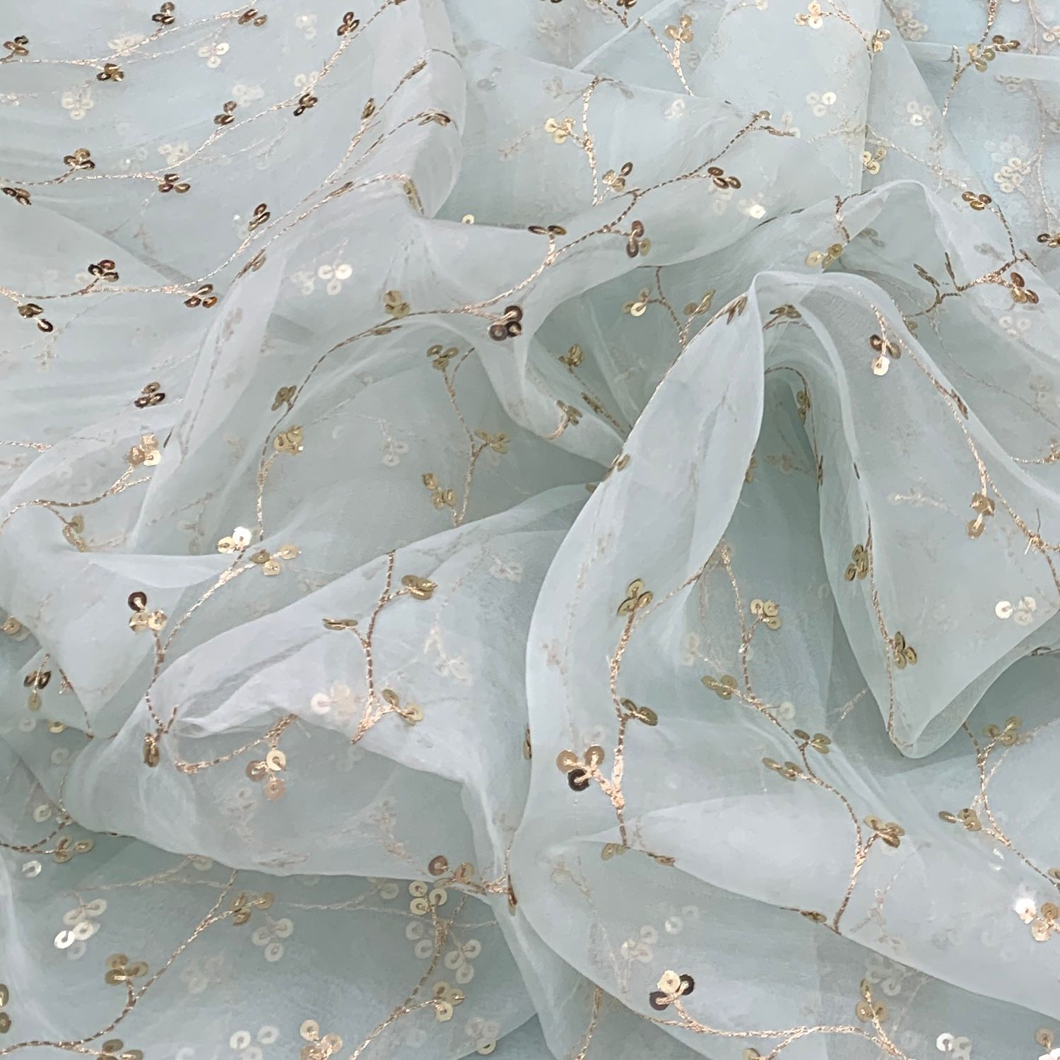 Organza is a lightweight, sheer fabric with a crisp finish, perfect for creating elegant sarees, gowns, and couture designs. Its subtle transparency and fine texture bring a refined, luxurious touch to any ensemble