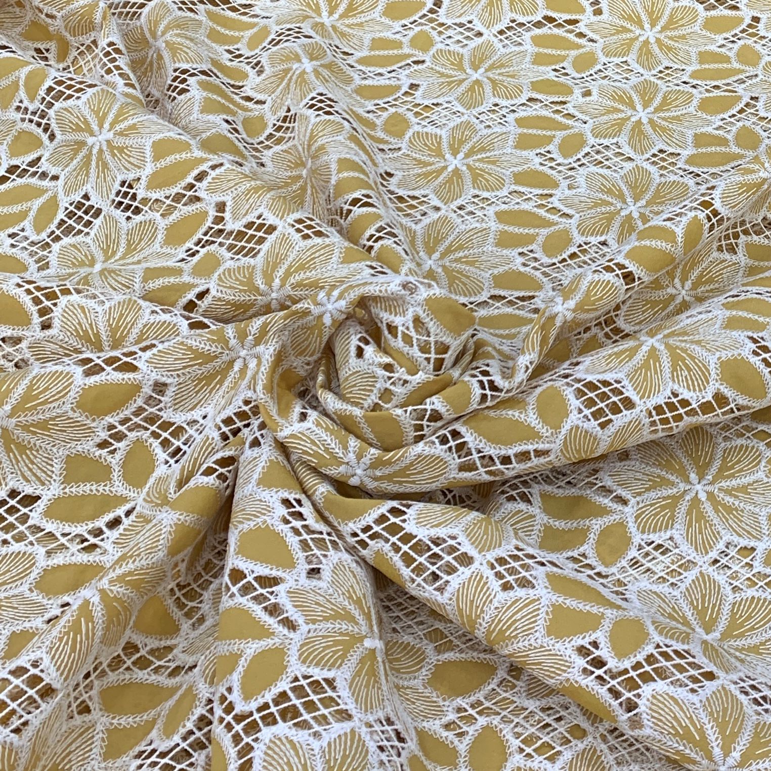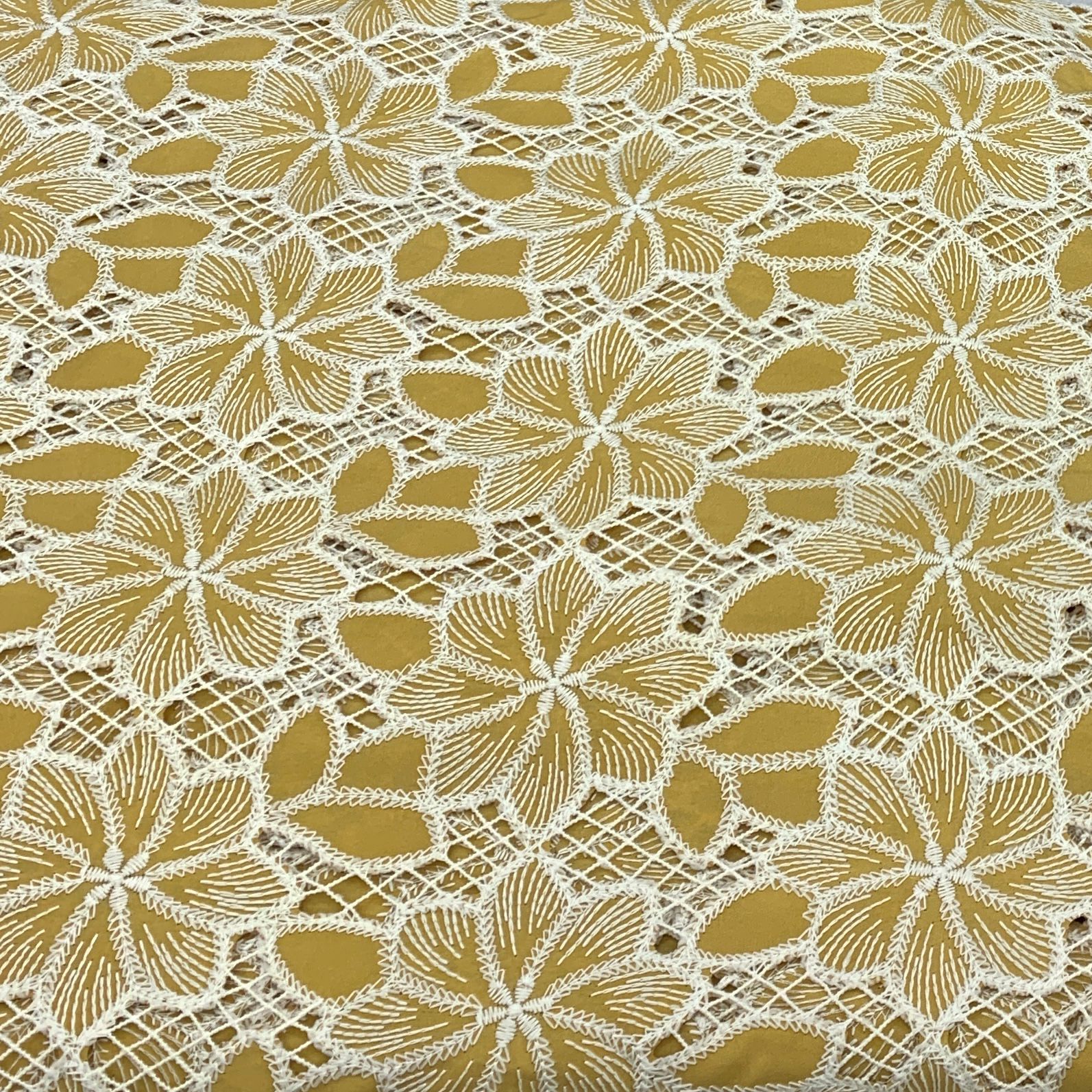Crepe cutwork fabric features a lightweight, textured crepe base adorned with intricate cut-out patterns, creating a delicate, semi-sheer effect. Its elegant drape and detailed craftsmanship make it perfect for stylish apparel, sophisticated overlays, and statement pieces