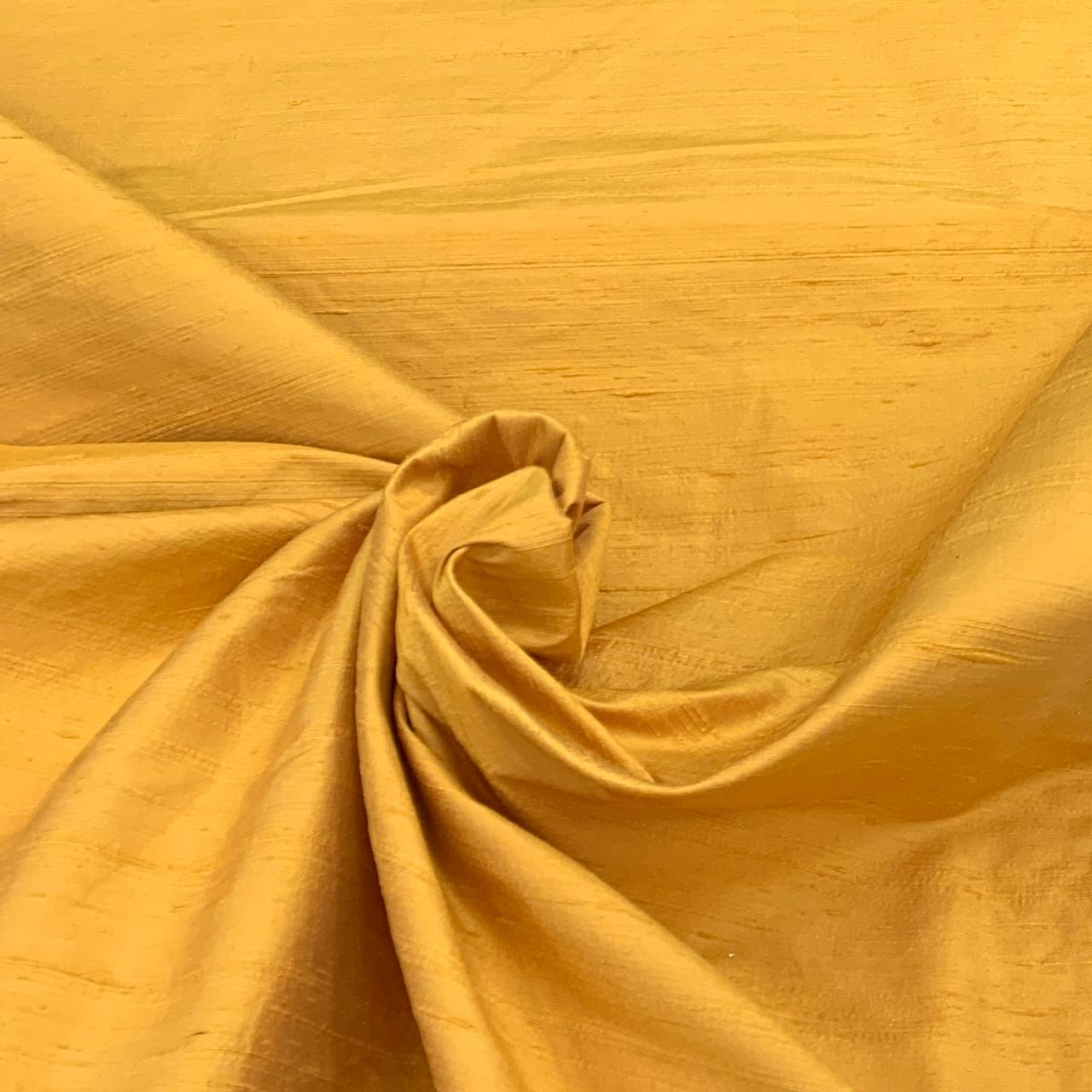 Mustard Yellow Plain Raw Silk Fabric. Continuous filaments of silk, with no twist, which have been reeled from cocoons but are unprocessed and comes with a slub effect. Raw Silk has a nubby feel with a low sheen. It resembles cotton in surface texture and sews easily. When these short fibers are spun into yarns, the resulting yarns have occasional slubs and specks that add to its appeal. Nubs vary between different weaves. Sportier in appearance, Raw Silk has the look of hopsack but is much softer.