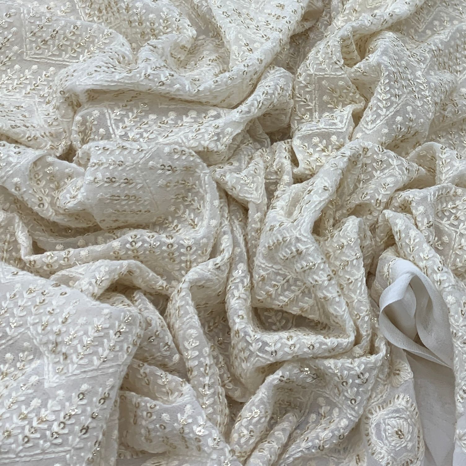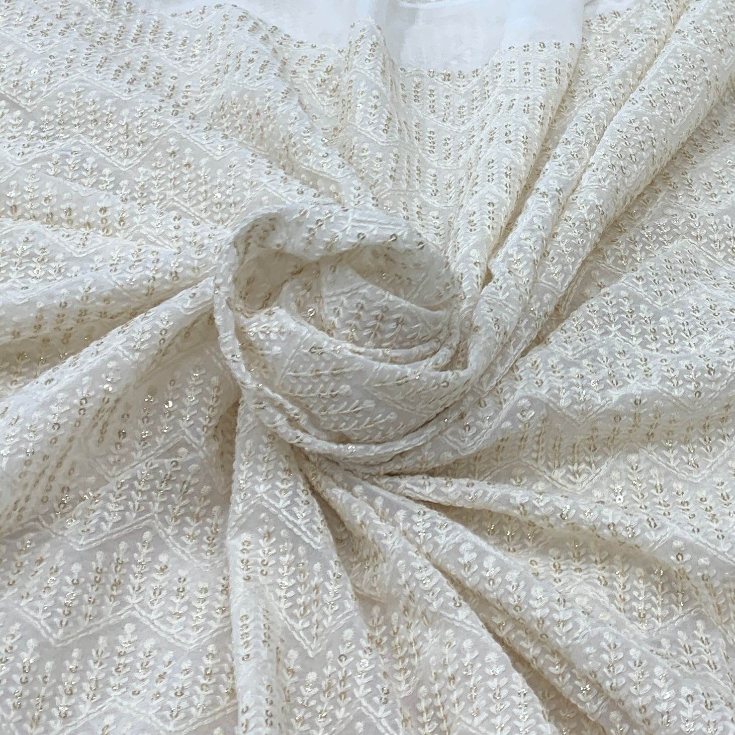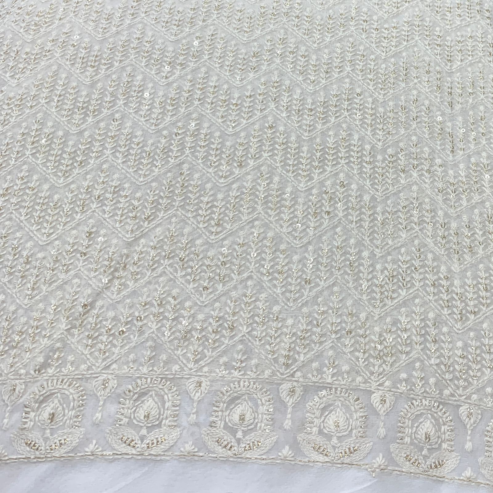 Georgette embroidered fabric is lightweight, flowy, and stylish, perfect for both men's and women's fashion. Ideal for sarees, gowns, lehengas, kurtis, dupattas, sherwanis, and jackets, its soft drape adds elegance, making it a refined choice for weddings, festivals, and special occasions