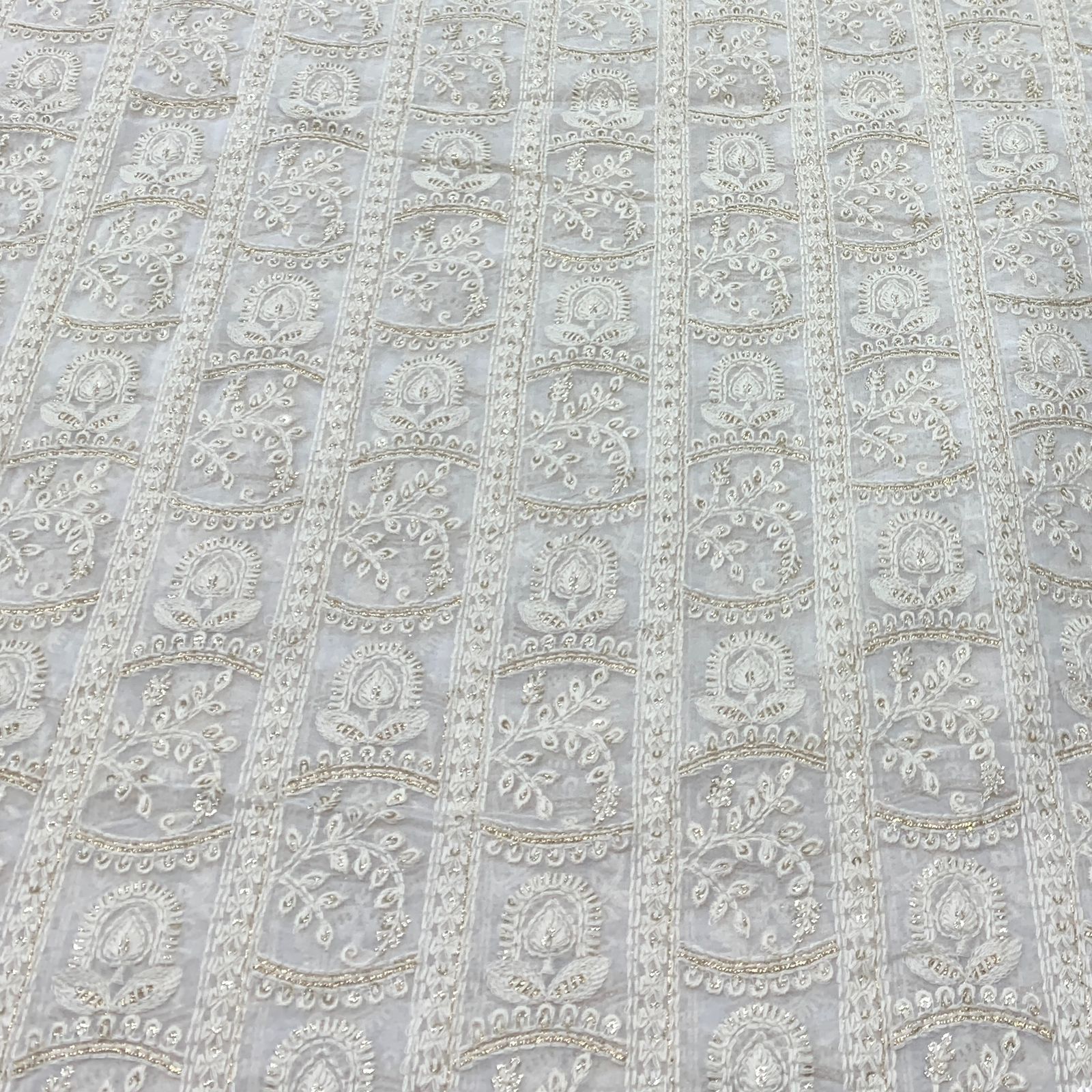 Georgette embroidered fabric is lightweight, flowy, and stylish, perfect for both men's and women's fashion. Ideal for sarees, gowns, lehengas, kurtis, dupattas, sherwanis, and jackets, its soft drape adds elegance, making it a refined choice for weddings, festivals, and special occasions