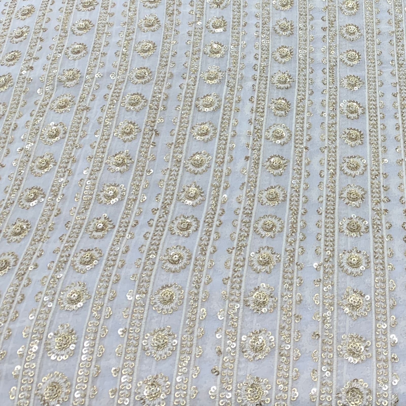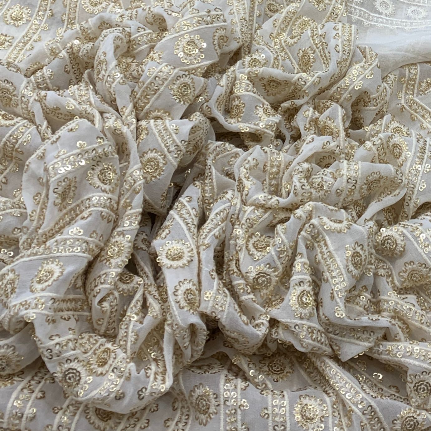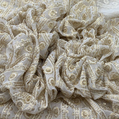 Georgette embroidered fabric is lightweight, flowy, and stylish, perfect for both men's and women's fashion. Ideal for sarees, gowns, lehengas, kurtis, dupattas, sherwanis, and jackets, its soft drape adds elegance, making it a refined choice for weddings, festivals, and special occasions