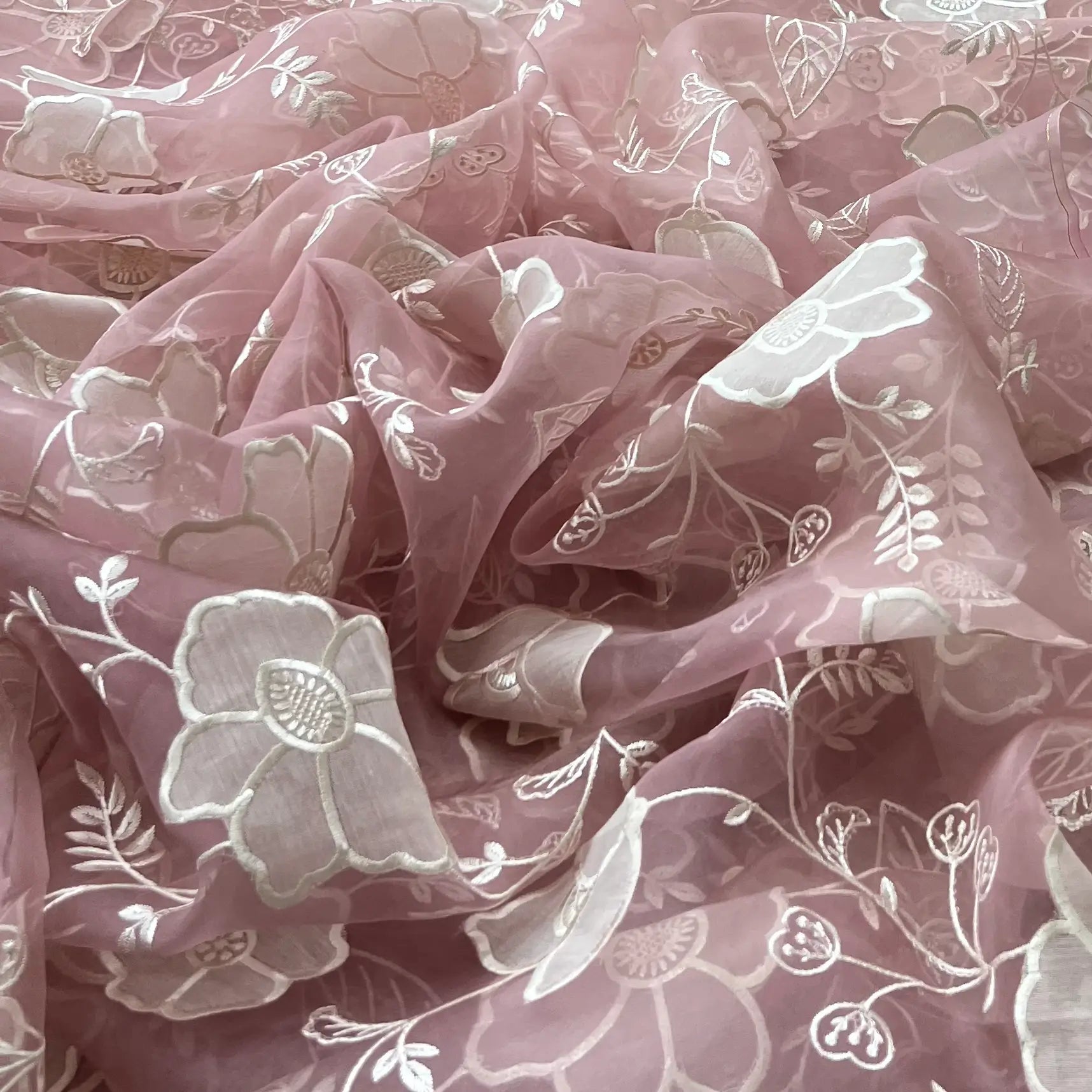 Organza is a lightweight, sheer fabric with a crisp finish, perfect for creating elegant sarees, gowns, and couture designs. Its subtle transparency and fine texture bring a refined, luxurious touch to any ensemble