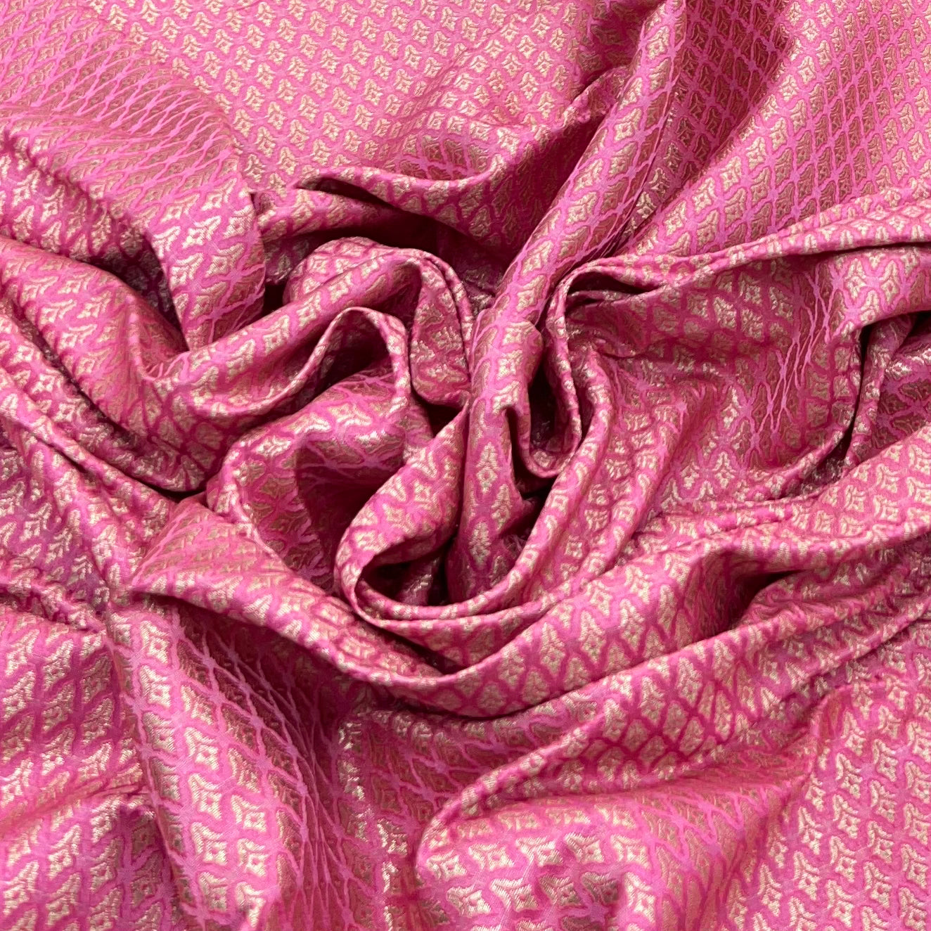 Silk brocade is an opulent fabric crafted with elaborate designs in silk and metallic threads, creating a richly textured surface. Celebrated for its durability and majestic appeal, it is perfect for sarees, lehengas, sherwanis, jackets, and festive attire, bringing a touch of timeless luxury to every creation