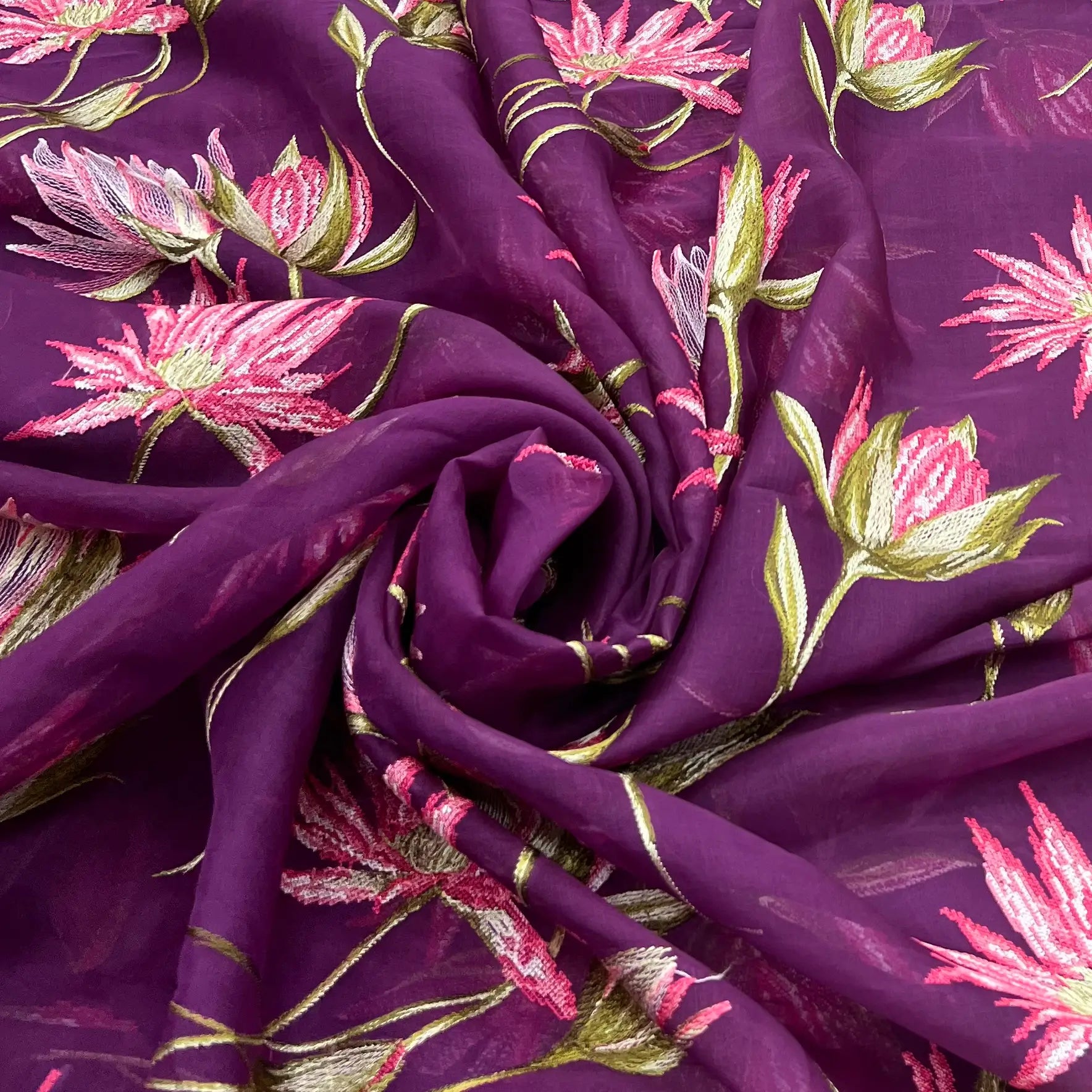Organza is a lightweight, sheer fabric with a crisp finish, perfect for creating elegant sarees, gowns, and couture designs. Its subtle transparency and fine texture bring a refined, luxurious touch to any ensemble