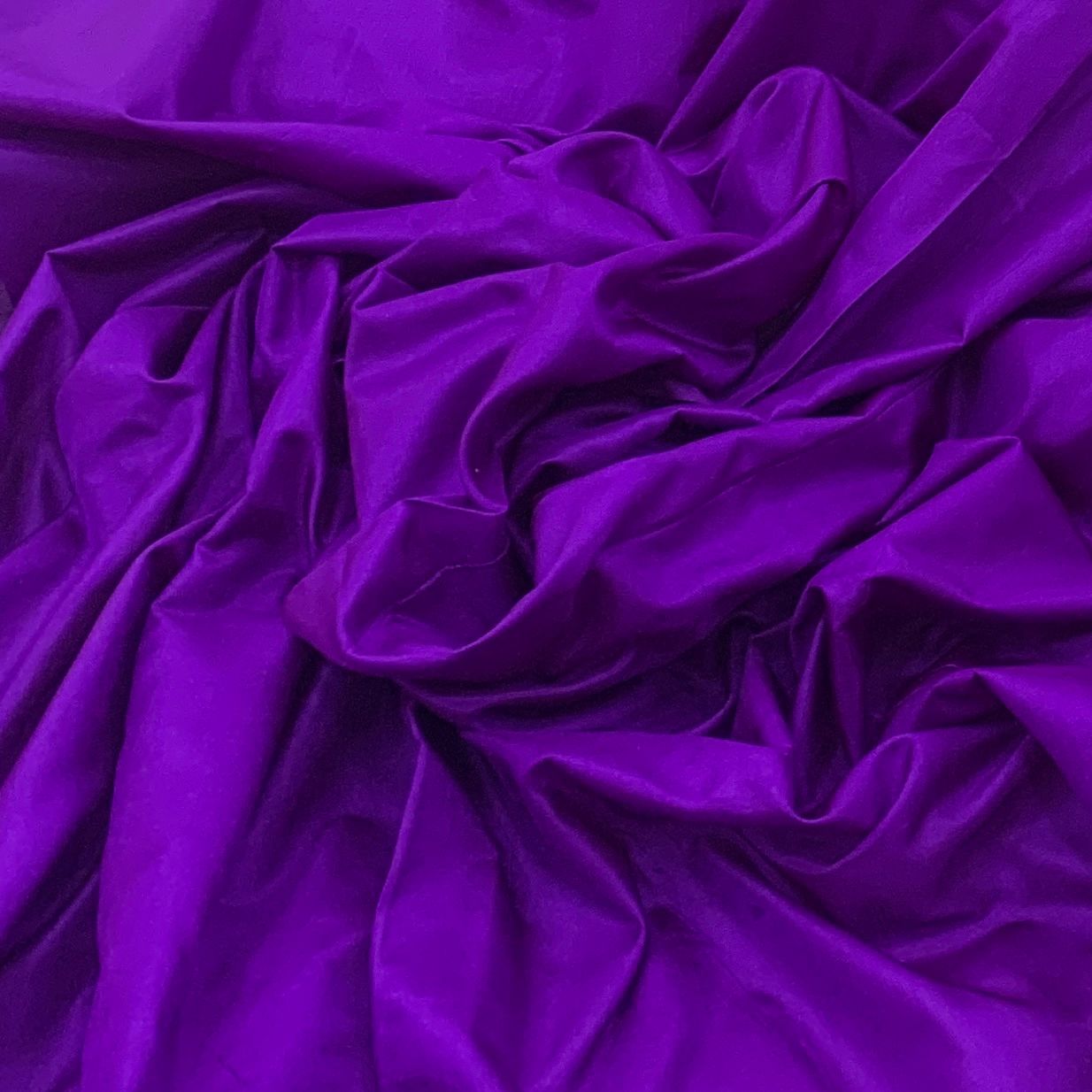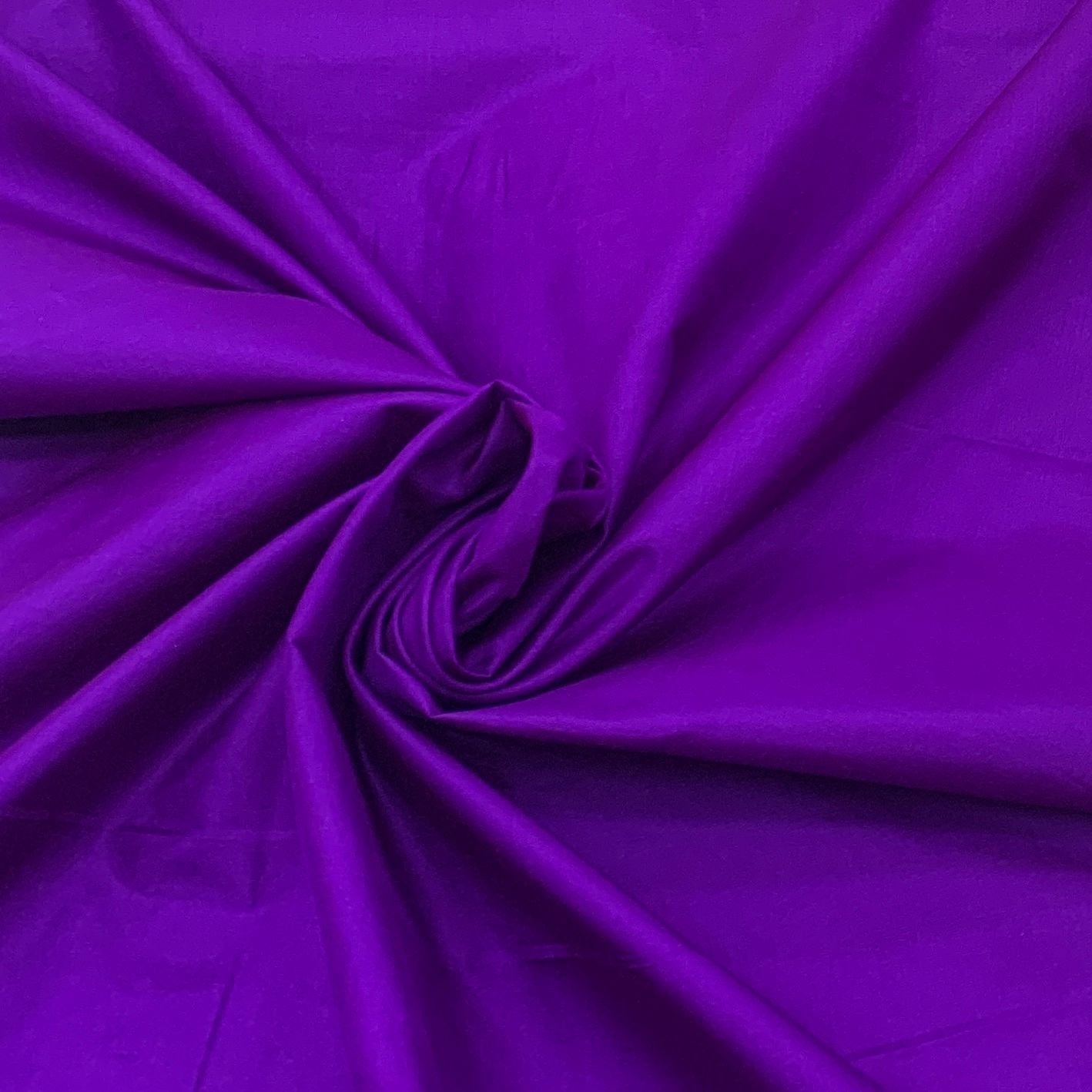 Purple Plain Pure Silk Fabric. Continuous filaments of silk, with no twist, which have been reeled from cocoons but are unprocessed and comes with a slub effect. Raw Silk has a nubby feel with a low sheen. It resembles cotton in surface texture and sews easily. When these short fibers are spun into yarns, the resulting yarns have occasional slubs and specks that add to its appeal. Nubs vary between different weaves. Sportier in appearance, Raw Silk has the look of hopsack but is much softer.