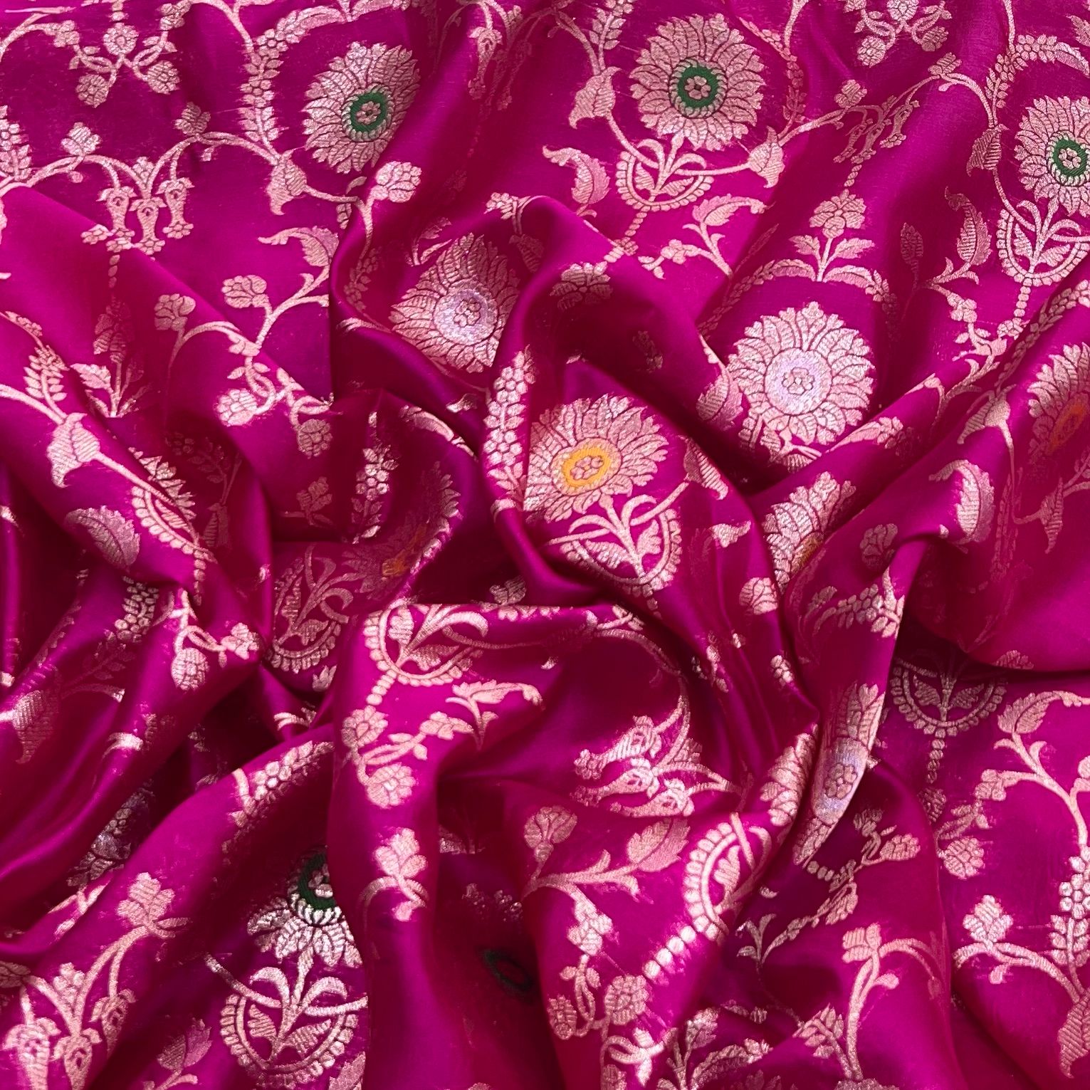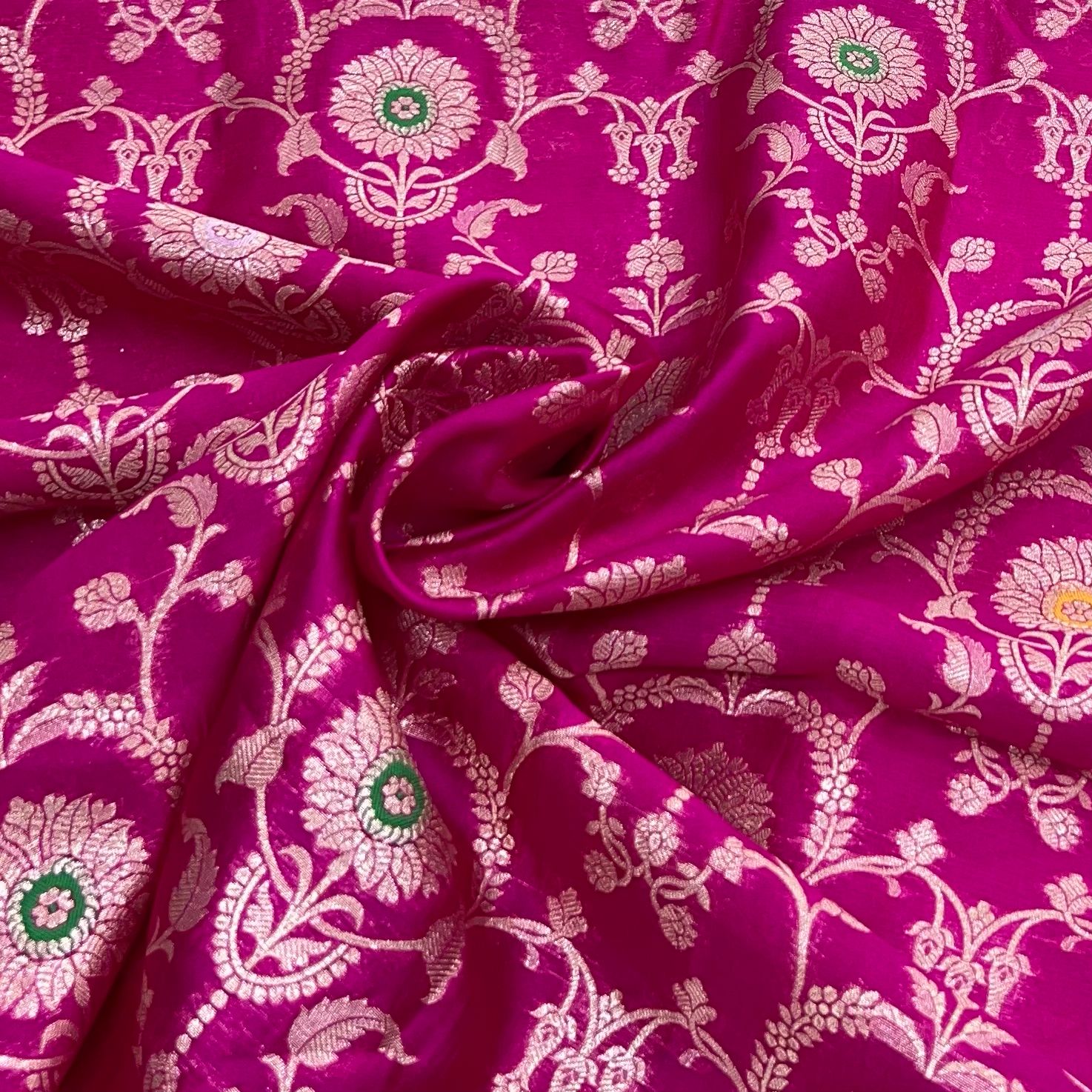 Silk brocade is an opulent fabric crafted with elaborate designs in silk and metallic threads, creating a richly textured surface. Celebrated for its durability and majestic appeal, it is perfect for sarees, lehengas, sherwanis, jackets, and festive attire, bringing a touch of timeless luxury to every creation