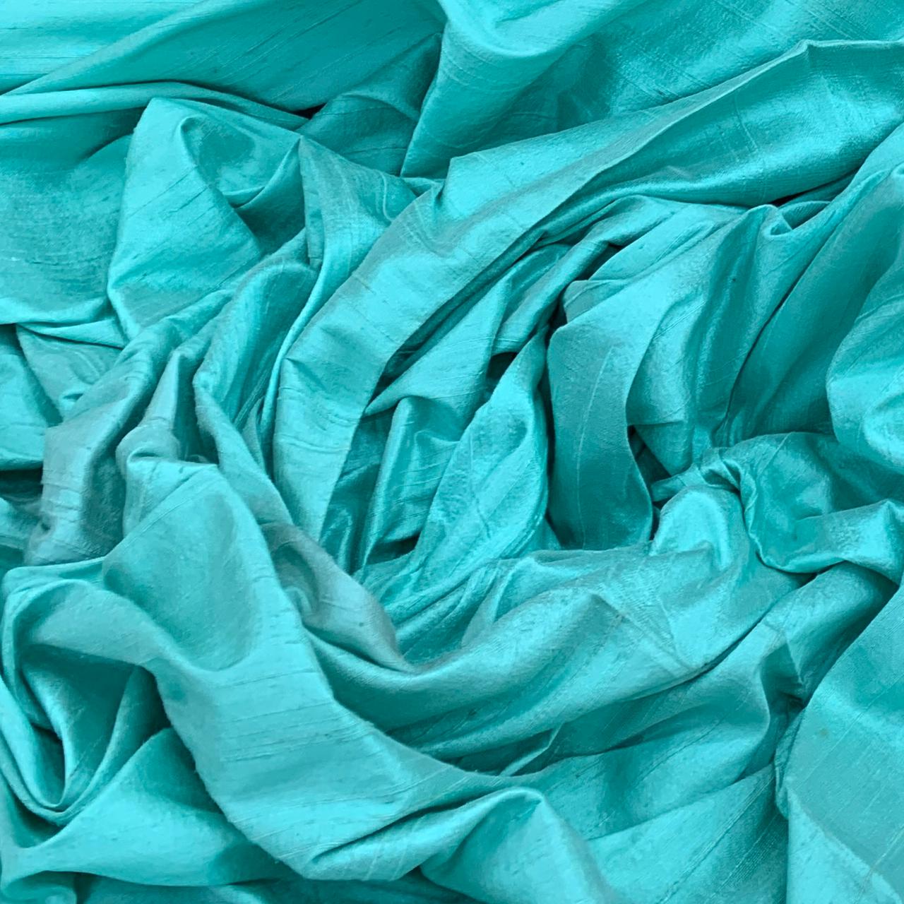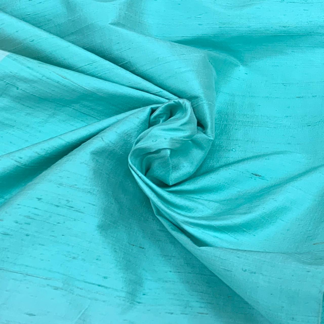 Sea Green Plain Raw Silk Fabric. Continuous filaments of silk, with no twist, which have been reeled from cocoons but are unprocessed and comes with a slub effect. Raw Silk has a nubby feel with a low sheen. It resembles cotton in surface texture and sews easily. When these short fibers are spun into yarns, the resulting yarns have occasional slubs and specks that add to its appeal. Nubs vary between different weaves. Sportier in appearance, Raw Silk has the look of hopsack but is much softer.