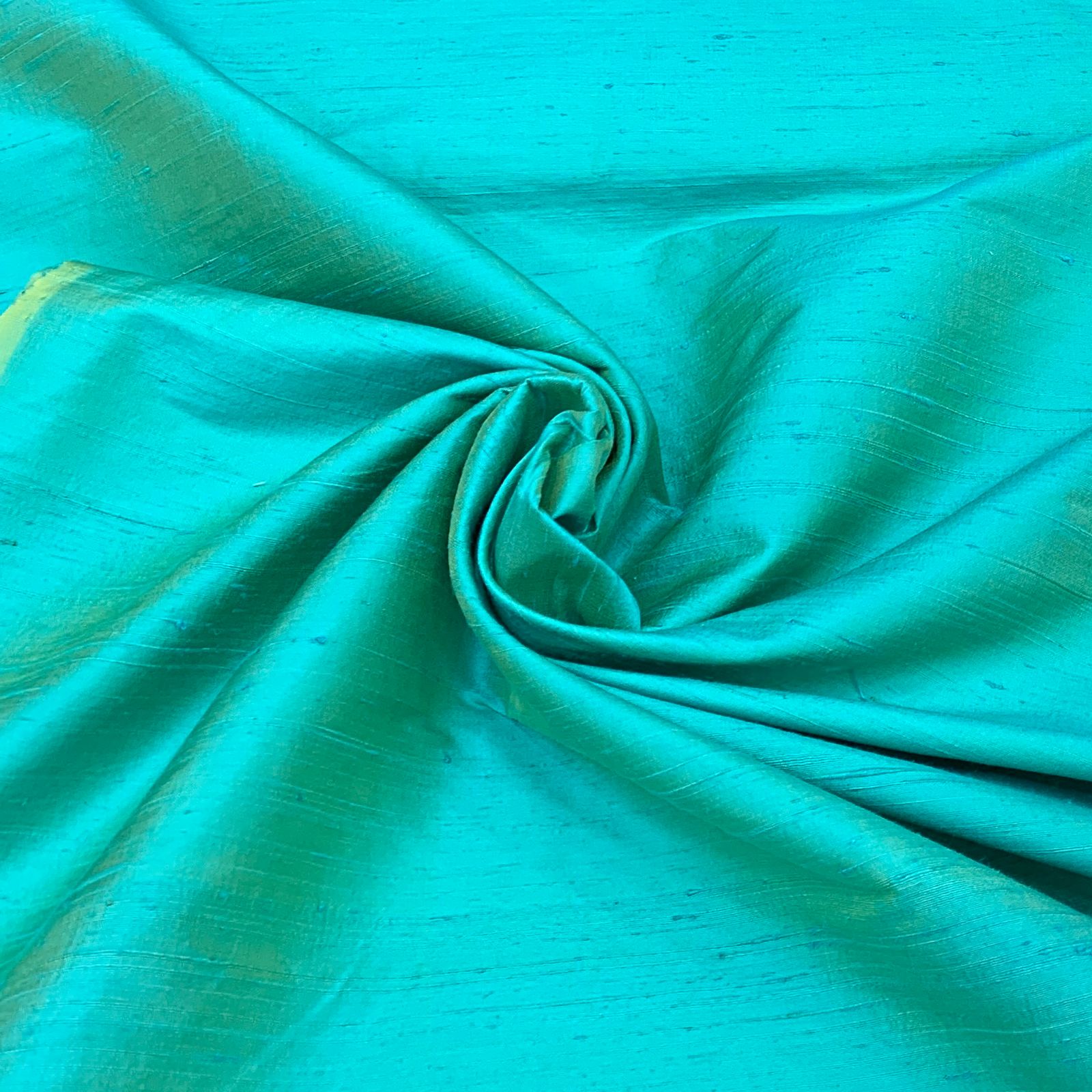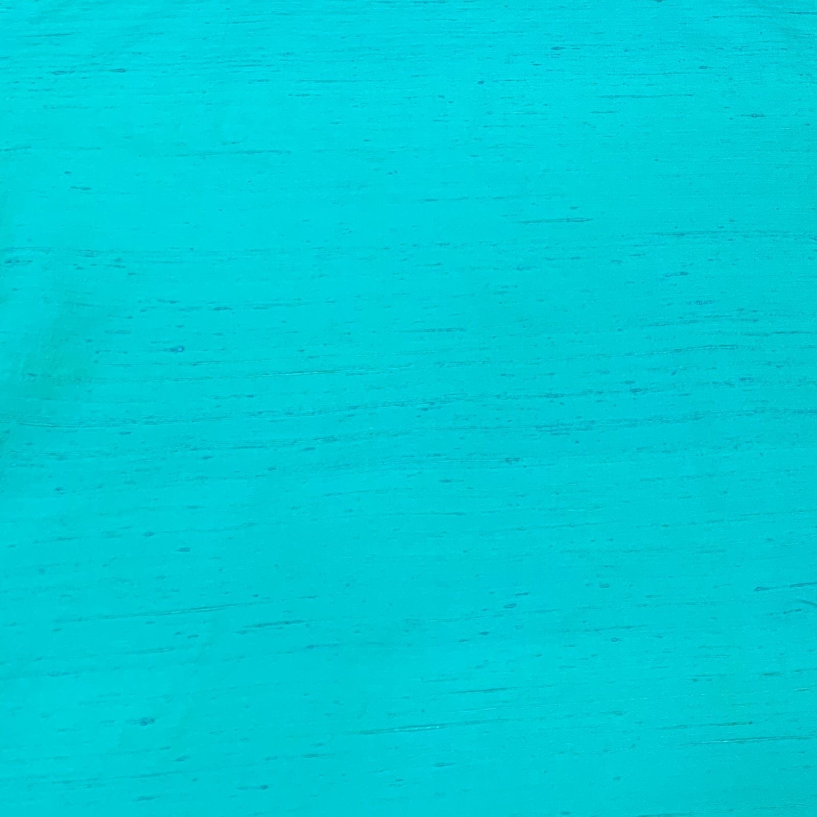 Turquoise Green Plain Raw Silk Fabric. Continuous filaments of silk, with no twist, which have been reeled from cocoons but are unprocessed and comes with a slub effect. Raw Silk has a nubby feel with a low sheen. It resembles cotton in surface texture and sews easily. When these short fibers are spun into yarns, the resulting yarns have occasional slubs and specks that add to its appeal. Nubs vary between different weaves. Sportier in appearance, Raw Silk has the look of hopsack but is much softer.