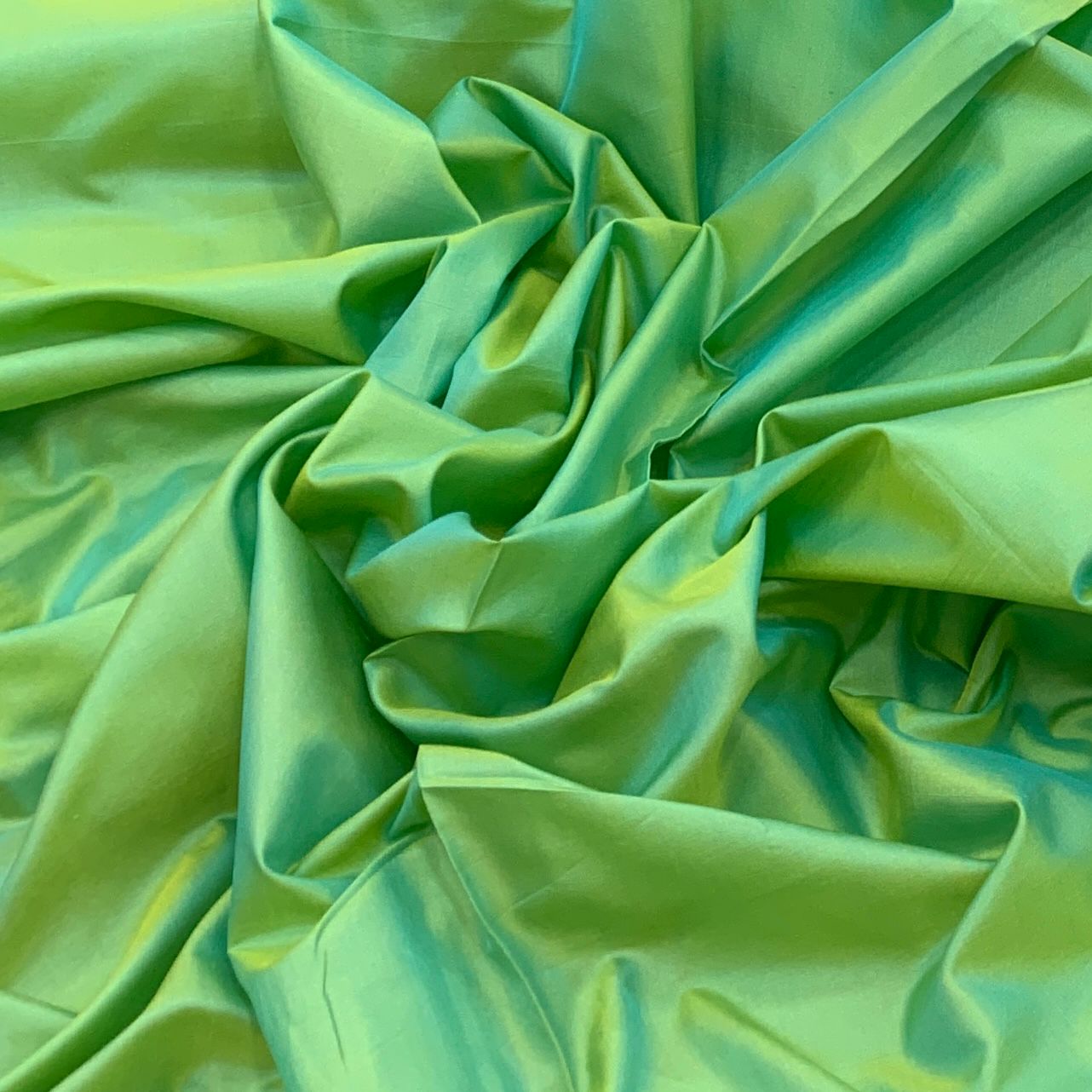 Two Tone Green Plain Pure Silk Fabric. Continuous filaments of silk, with no twist, which have been reeled from cocoons but are unprocessed and comes with a slub effect. Raw Silk has a nubby feel with a low sheen. It resembles cotton in surface texture and sews easily. When these short fibers are spun into yarns, the resulting yarns have occasional slubs and specks that add to its appeal. Nubs vary between different weaves. Sportier in appearance, Raw Silk has the look of hopsack but is much softer.