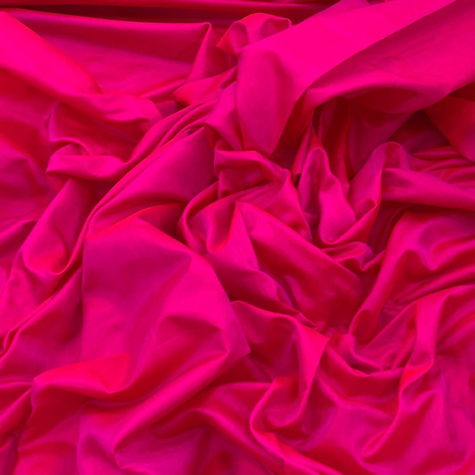 Two Tone Rani Pink Plain Pure Silk Fabric. Continuous filaments of silk, with no twist, which have been reeled from cocoons but are unprocessed and comes with a slub effect. Raw Silk has a nubby feel with a low sheen. It resembles cotton in surface texture and sews easily. When these short fibers are spun into yarns, the resulting yarns have occasional slubs and specks that add to its appeal. Nubs vary between different weaves. Sportier in appearance, Raw Silk has the look of hopsack but is much softer.