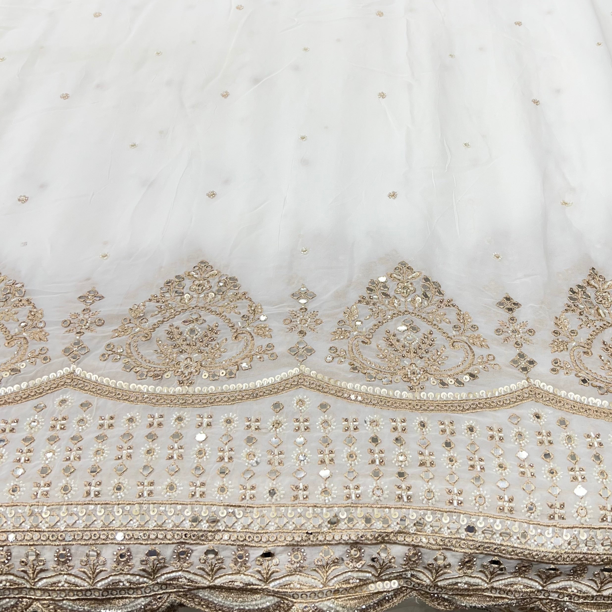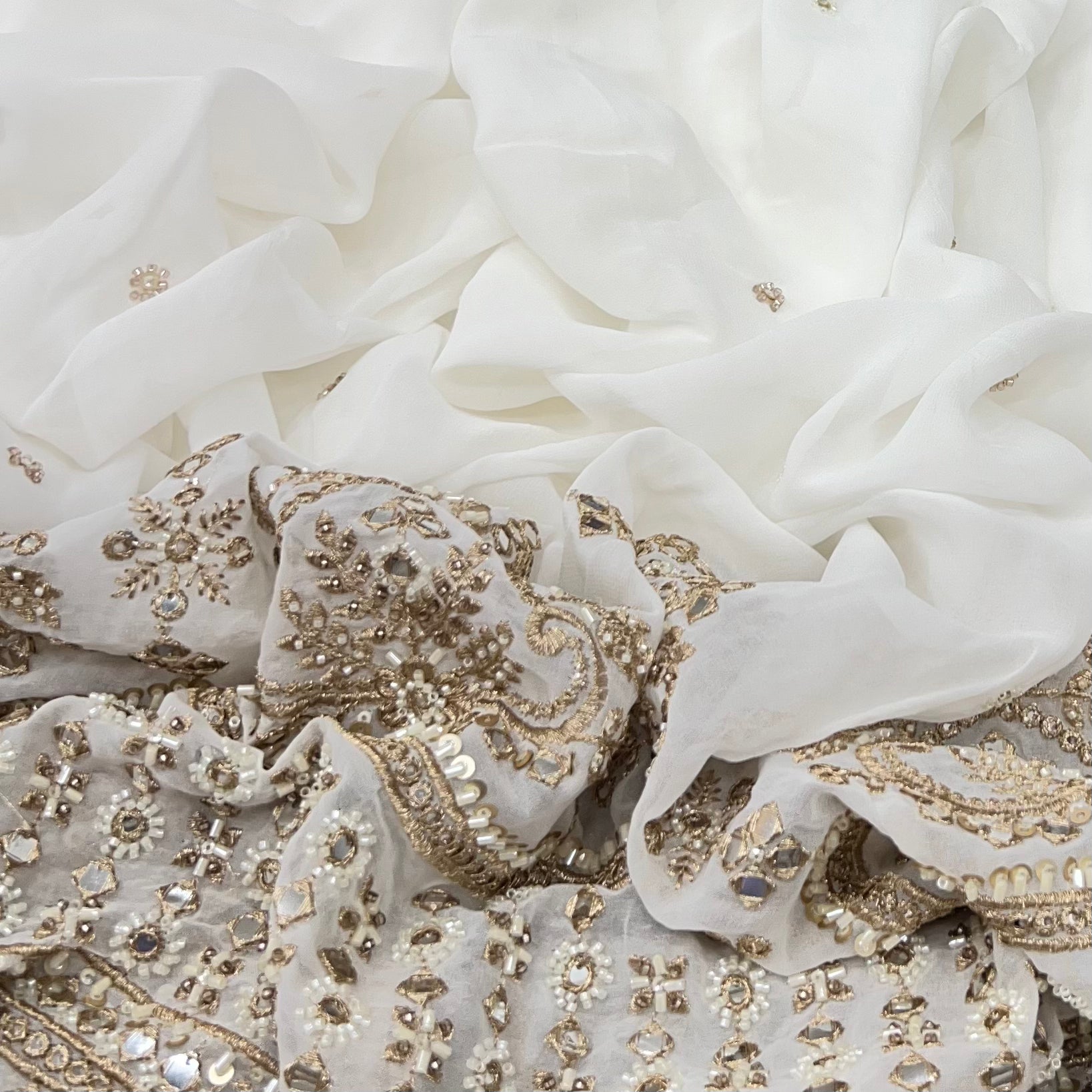 Georgette embroidered fabric is lightweight, flowy, and stylish, perfect for both men's and women's fashion. Ideal for sarees, gowns, lehengas, kurtis, dupattas, sherwanis, and jackets, its soft drape adds elegance, making it a refined choice for weddings, festivals, and special occasions