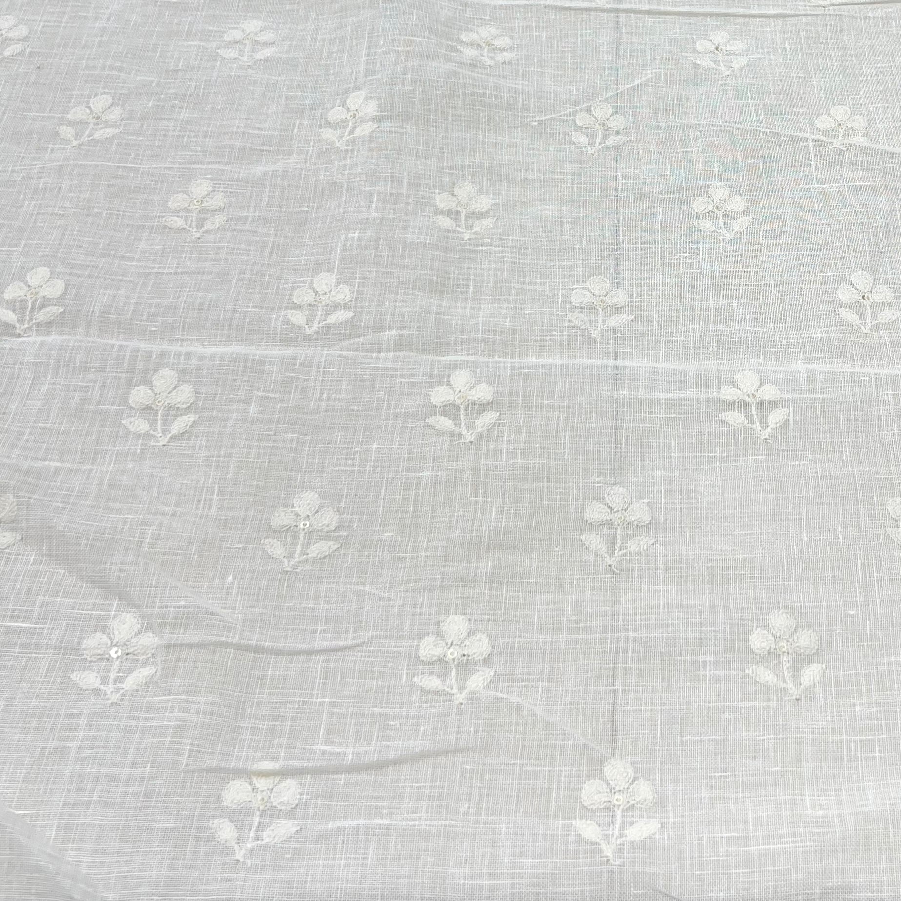 White Gauge Linen Flower Sequins Thread Butti Embroidery