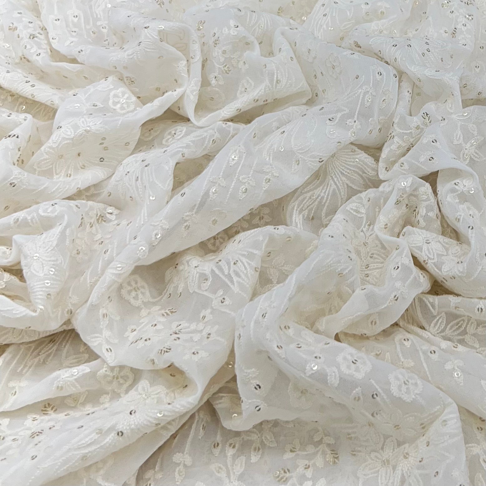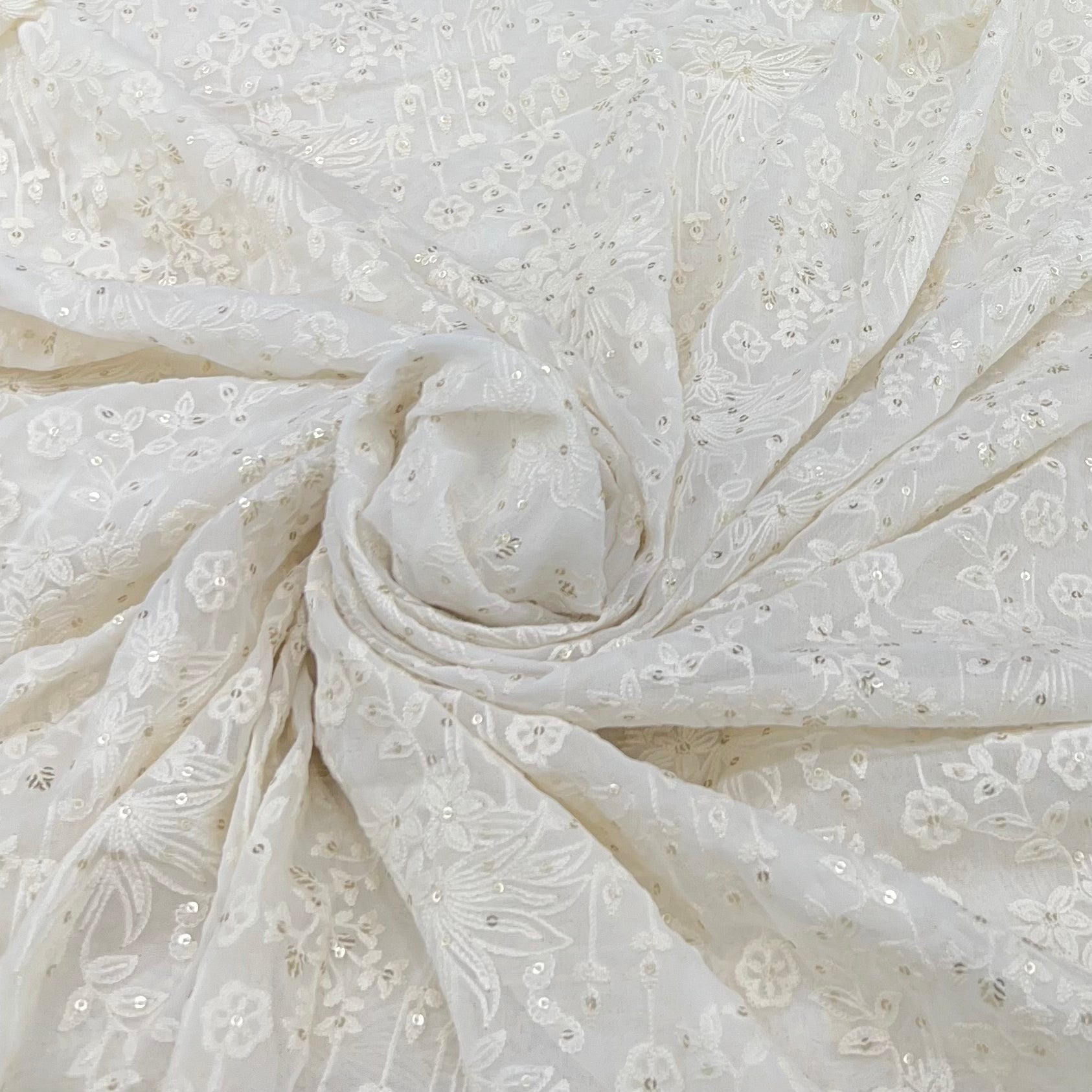 Georgette embroidered fabric is lightweight, flowy, and stylish, perfect for both men's and women's fashion. Ideal for sarees, gowns, lehengas, kurtis, dupattas, sherwanis, and jackets, its soft drape adds elegance, making it a refined choice for weddings, festivals, and special occasions