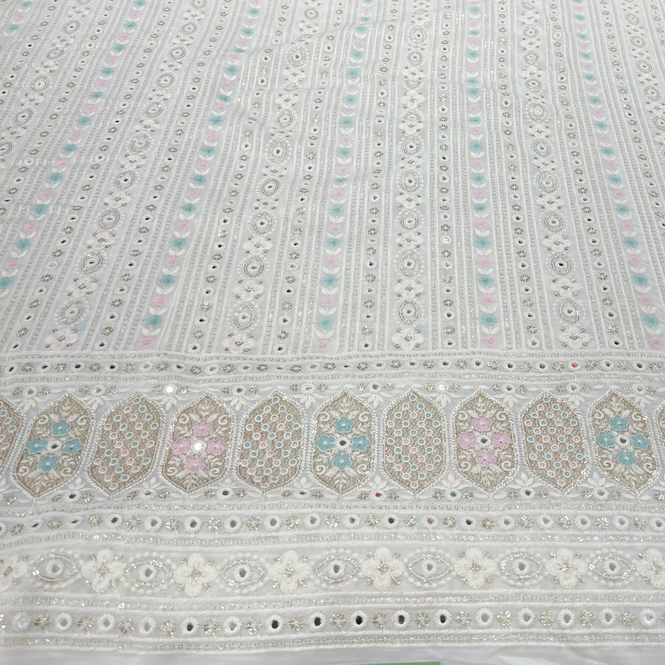 Georgette embroidered fabric is lightweight, flowy, and stylish, perfect for both men's and women's fashion. Ideal for sarees, gowns, lehengas, kurtis, dupattas, sherwanis, and jackets, its soft drape adds elegance, making it a refined choice for weddings, festivals, and special occasions