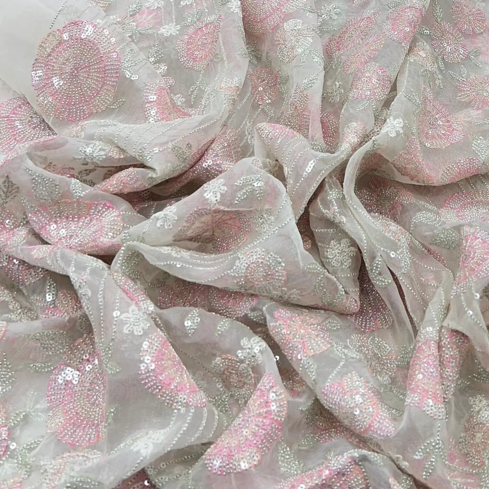 Organza is a lightweight, sheer fabric with a crisp finish, perfect for creating elegant sarees, gowns, and couture designs. Its subtle transparency and fine texture bring a refined, luxurious touch to any ensemble