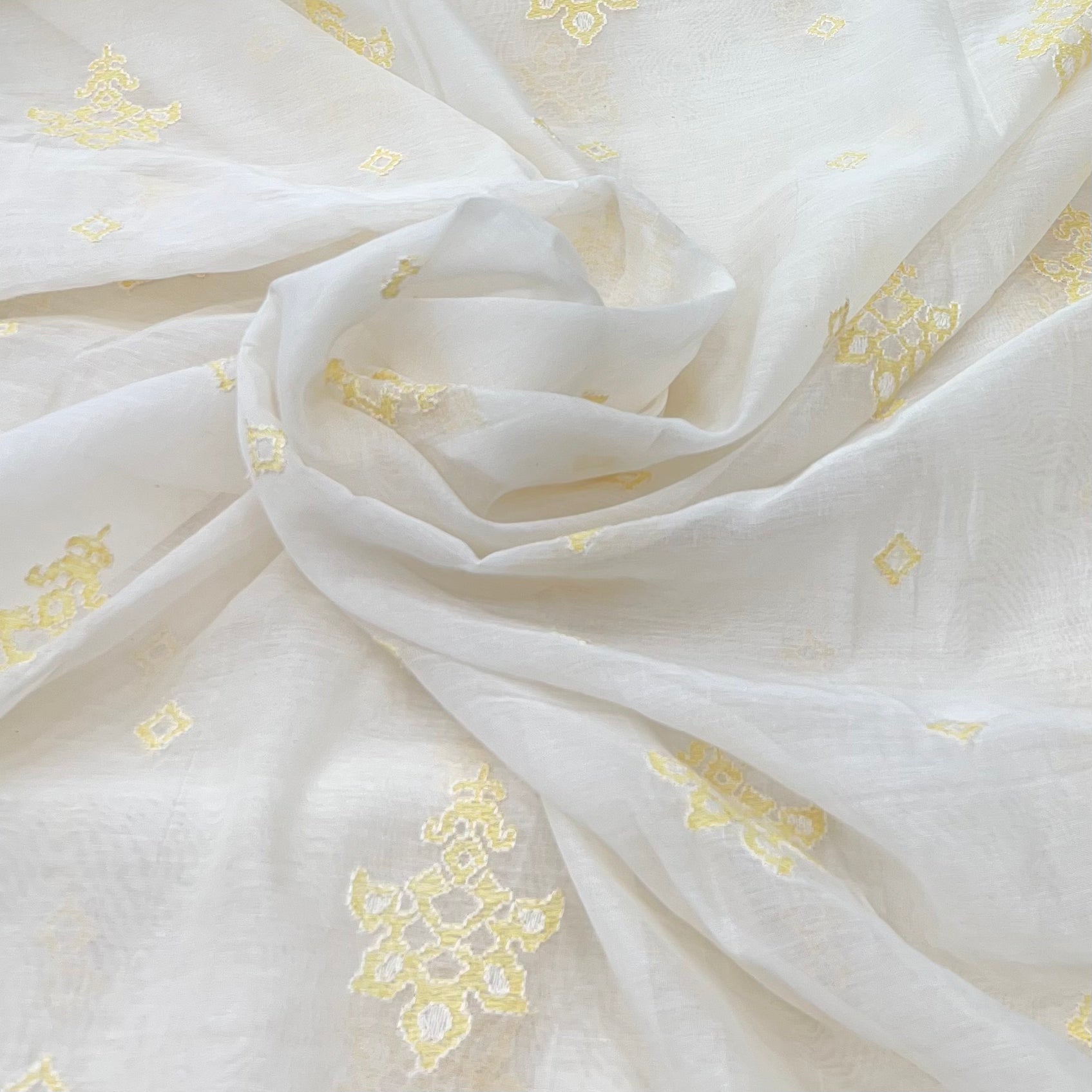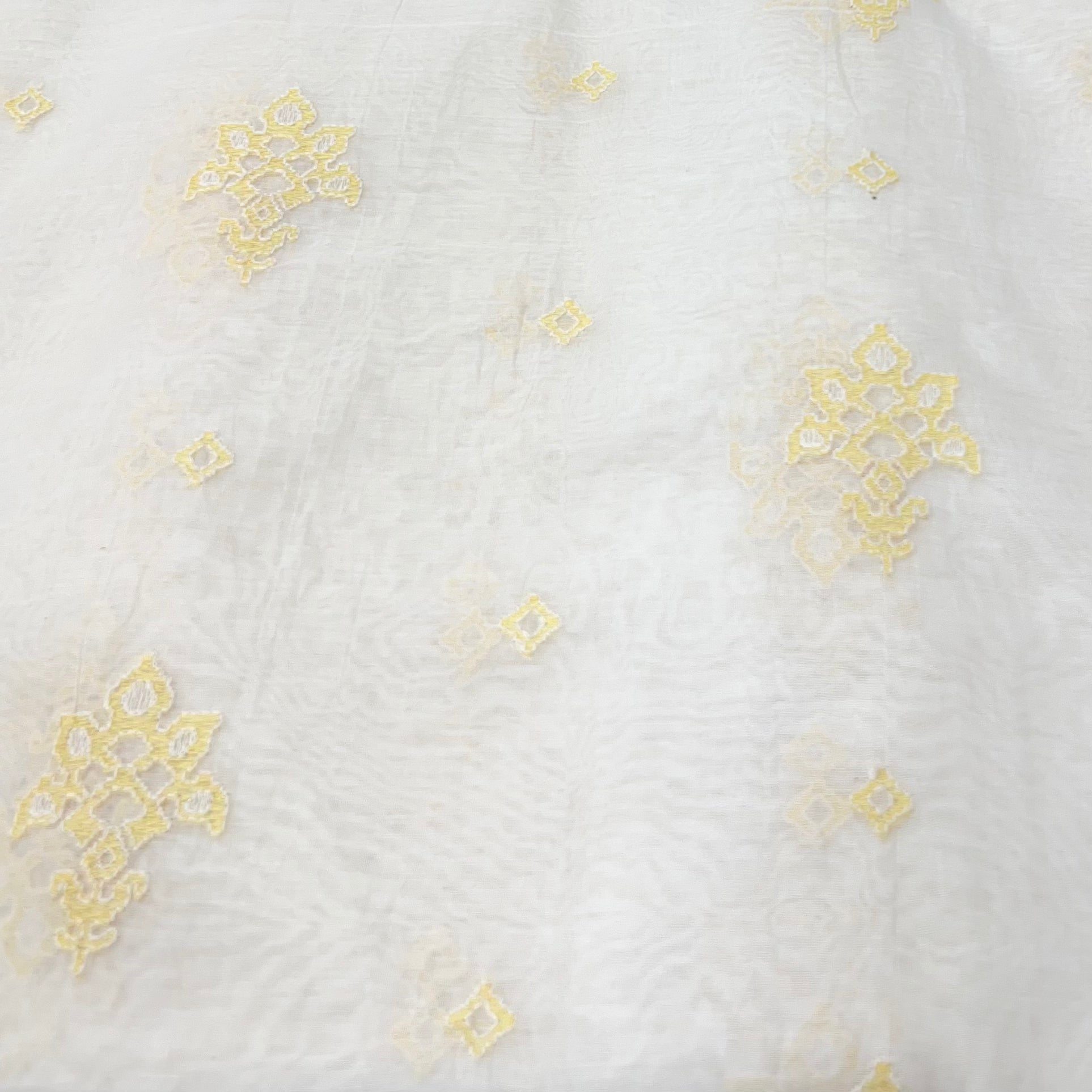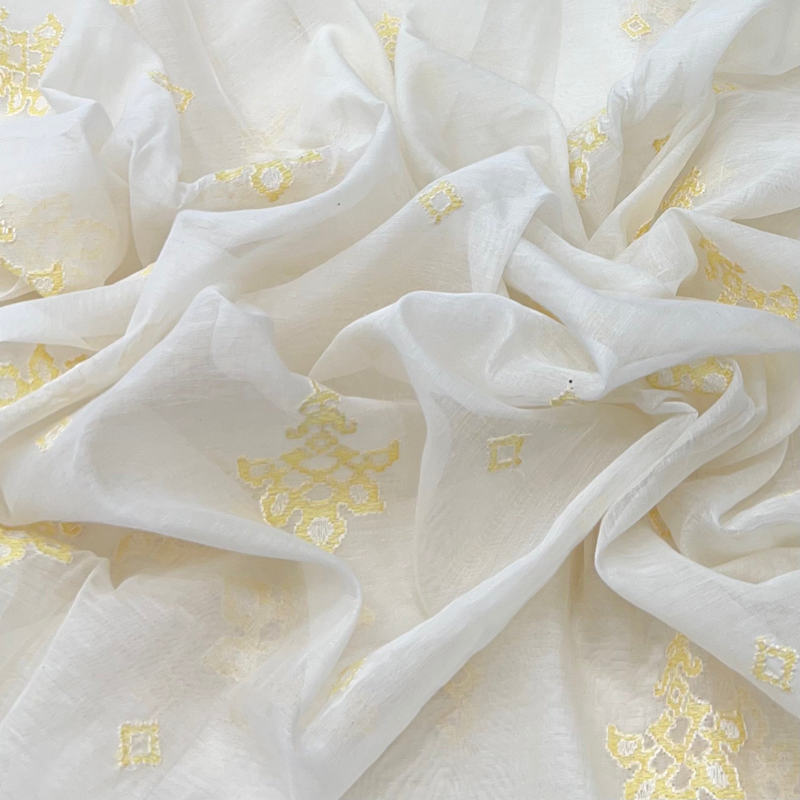 White With Yellow Geometric Mul Chanderi Thread Embroidery