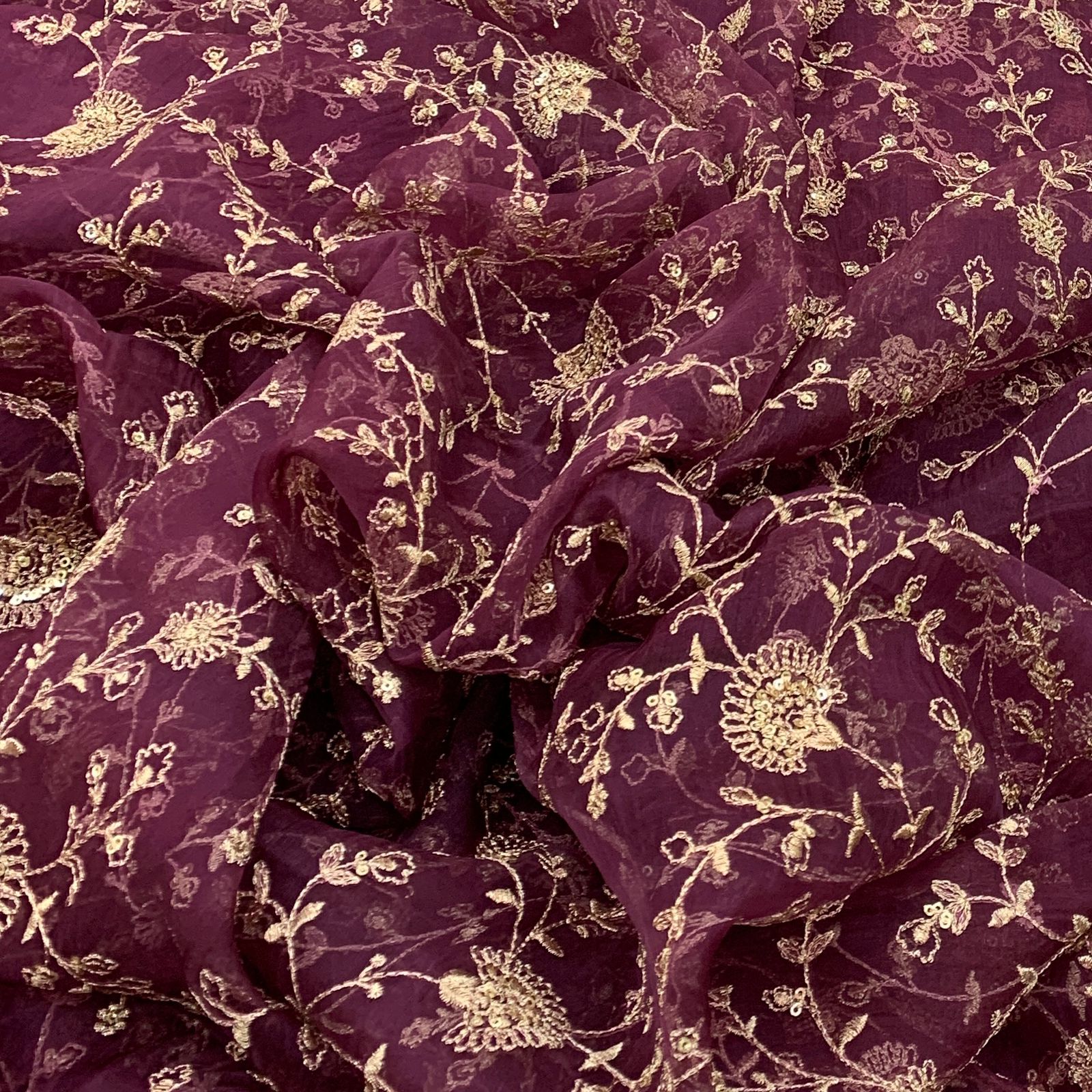 Organza is a lightweight, sheer fabric with a crisp finish, perfect for creating elegant sarees, gowns, and couture designs. Its subtle transparency and fine texture bring a refined, luxurious touch to any ensemble